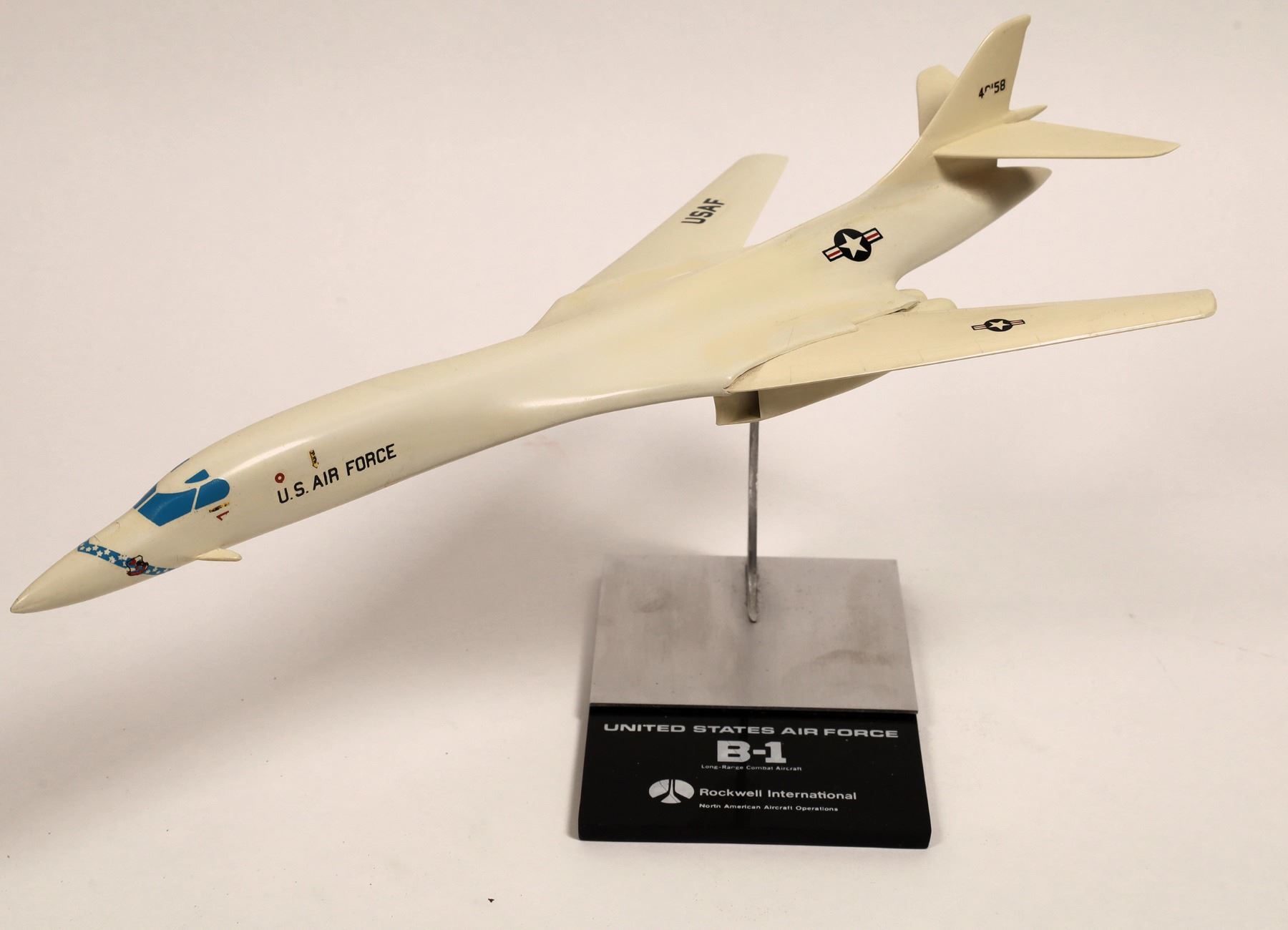 U.S. Air Force B-1 Bomber, Long Range Combat Aircraft- Rockwell International. North American Aircraft Operations. Includes stand. Desk model. Few scratches, no cracks. About 16" by 9".