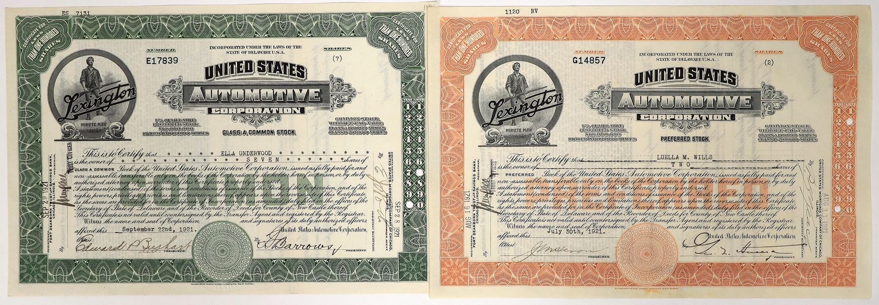 Issued orange and green 1920 US Automotive stocks with Lexington Minute Man vignettes.