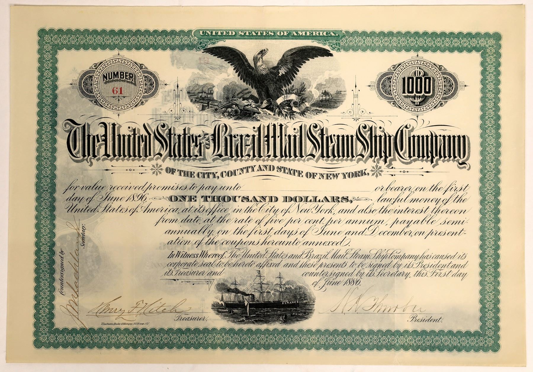 Cert. #61 fully issued for $1000 at 6%. Signed by Thurber and Fletch, the company officers. Nice vignettes of an eagle at the top and a mail steamship at the bottom. The bond was issued in 1886 and was to mature in 1896. Nine coupons attached at the bottom, Printed by Troutman, Bailey and Blampey, N.Y. VF. Uncanceled.