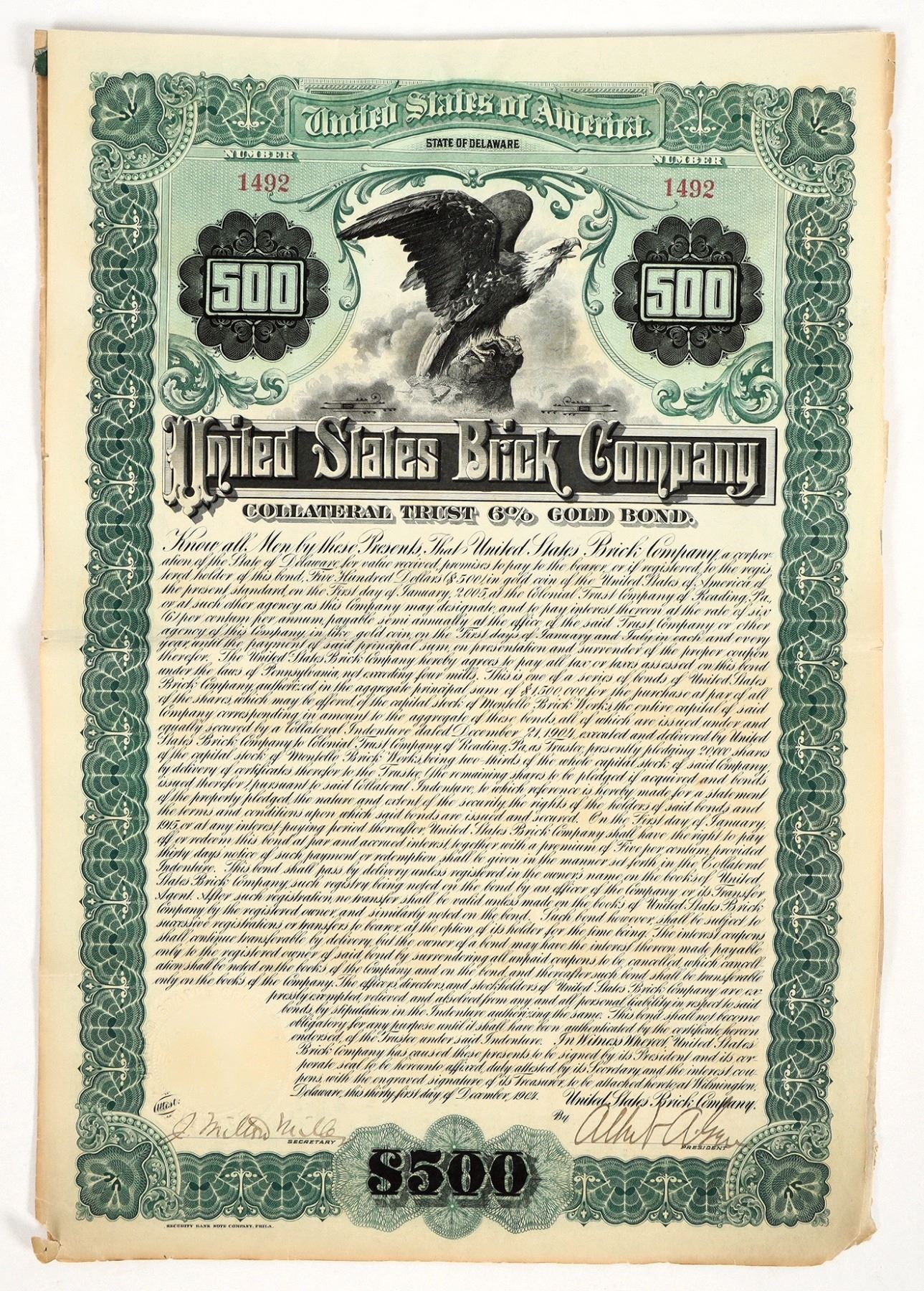 I/U. Issued 1904. Fine cond. United States Brick Co. Bond. , $500, 6% gold bearer bond. All but five coupons attached, embossed seal. Security BNC printer.