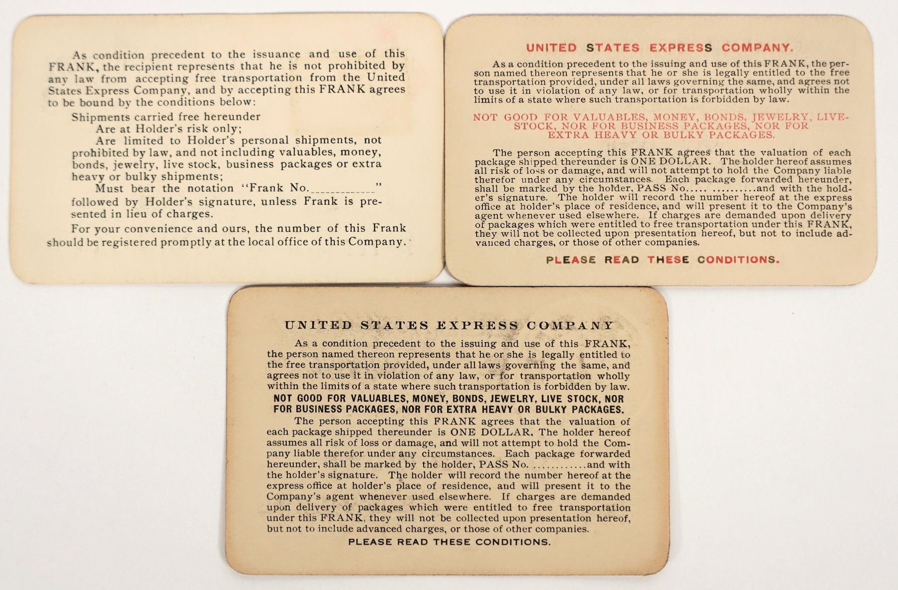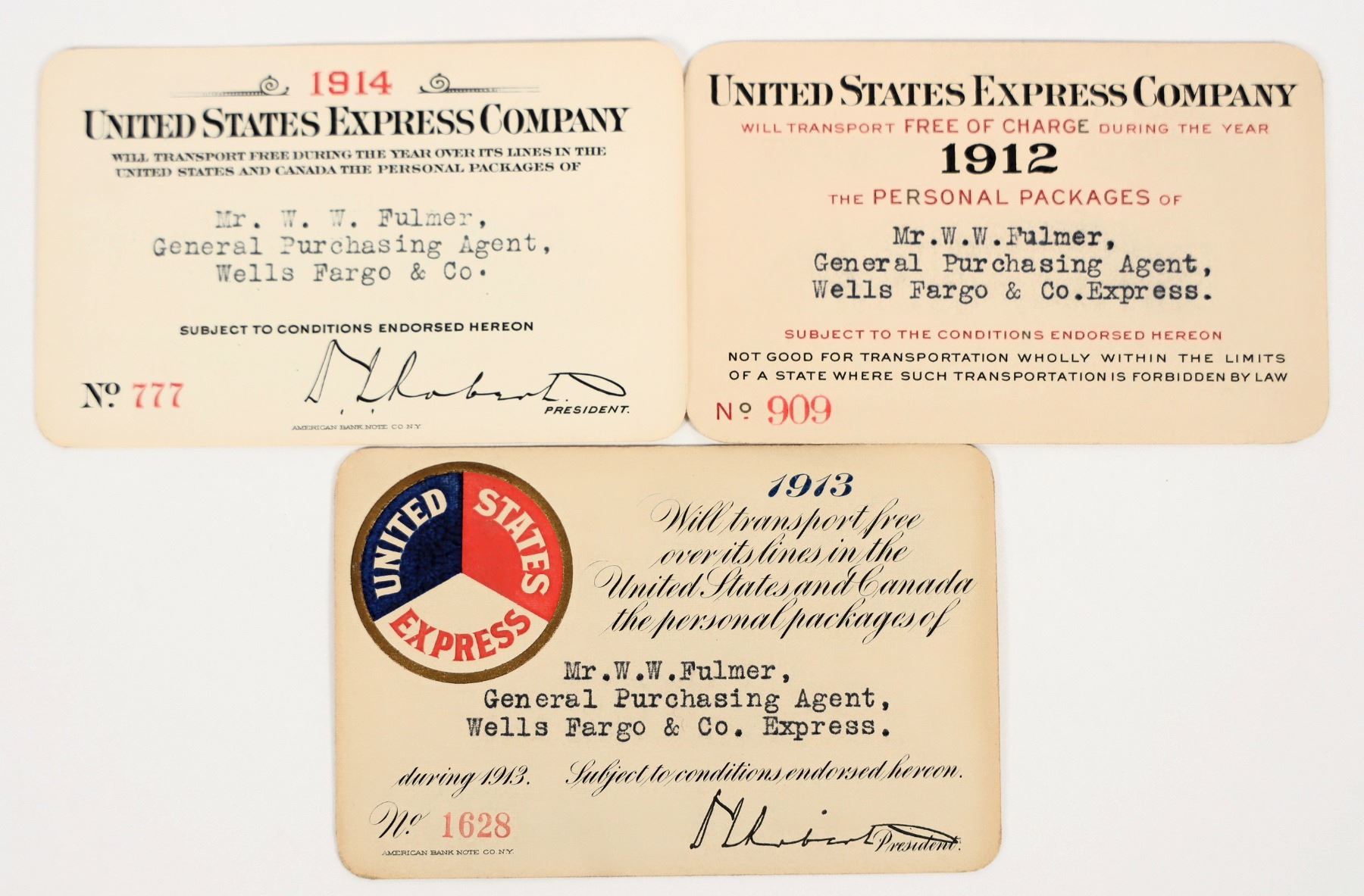 Lot of 3 different frank ("free") passes. 1912, 1913, 1914. All issued to WW Fulmer, General Purchasing Agent for Wells Fargo & Co. The United States Express Company was founded in 1854 in New York as one of the major express shipping firms that competed with Adams, American, and Wells Fargo. It provided freight, parcel, and financial express services across much of the eastern and midwestern United States, becoming a vital link for commerce during the mid-19th century. After struggling against competition and the rise of parcel post, the company ceased operations in 1914, marking the end of one of the early national express networks.