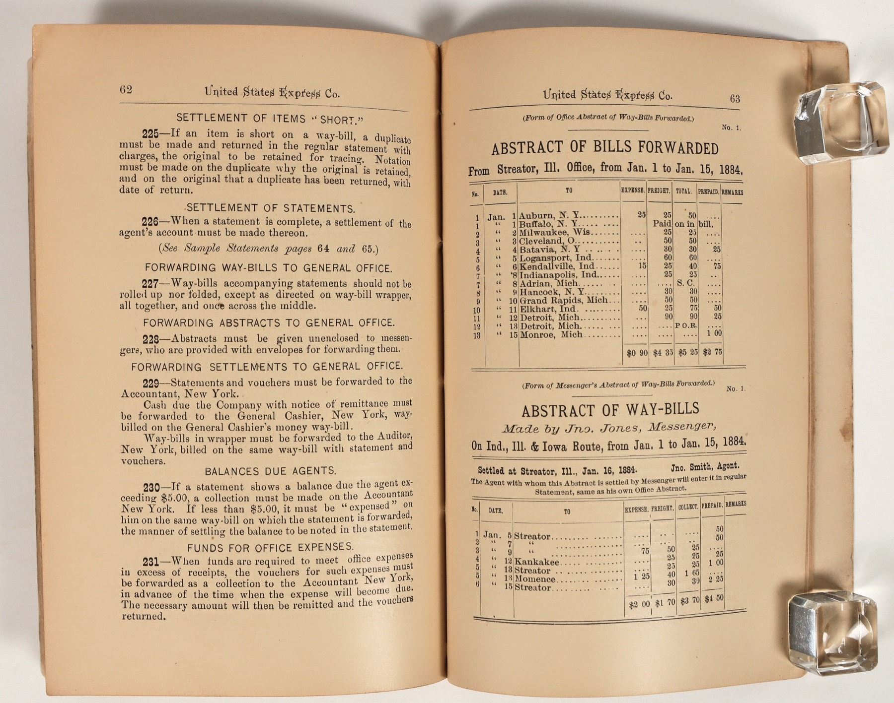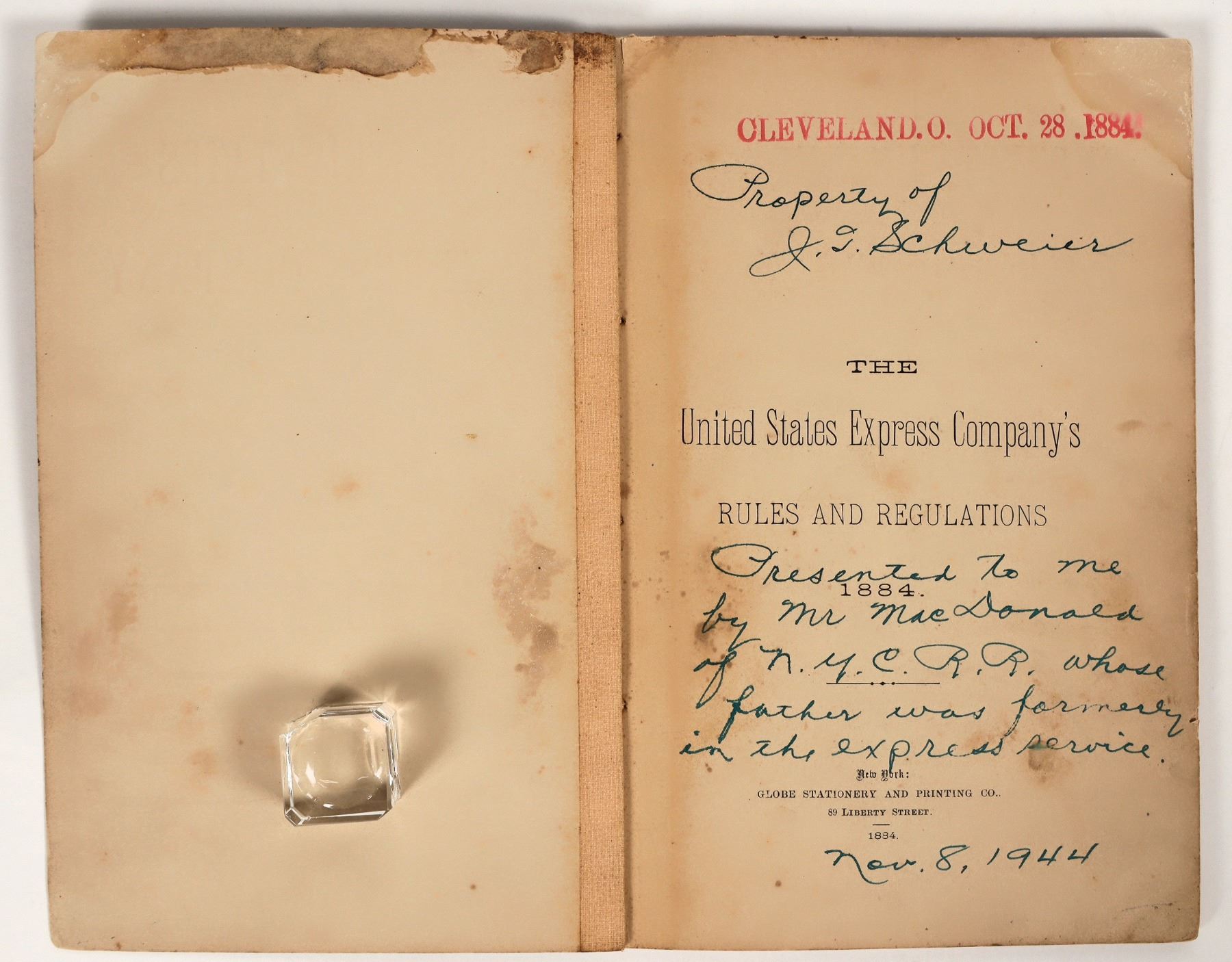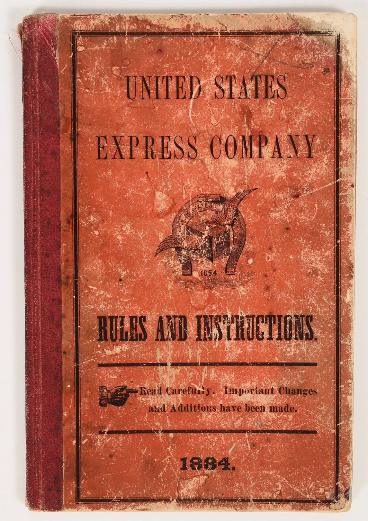 Very rare. Stamped "Cleveland. O. Oct. 28. 1884" on title page. Also has later inscription saying this is the property of J. Schweier, "Presented to me by Mr. MacDonald of N.Y.C.R.R. whose father was formerly in the express service. Nov. 8, 1944." 86pp. Includes 317 regulations/instructions based on nearly every situation the agent could encounter. Such as 287 "Suspicious Characters," which advises: "Messengers should keep close watch for suspicious characters watching their cars, also the movements of their cars while at stations. If an attempt is made by robbers to detach engine and Express car, the safe should be locked and thrown out at once, when the messenger may also leave the car if possible." Or No. 57, giving specific details on gold and silver coin shipments and packaging. (No bags can contain more than $5,000 gold or $500 silver.) Or No. 109 and 110, dealing with the transport of corpses. Or No. 256, advising that "Messengers on all first class routes must provide themselves with revolvers." No specific instructions for treasure boxes found. 8.5 x 5.75" Toning and stains, stains/wear to upper corners of pages and covers. Please inspect.