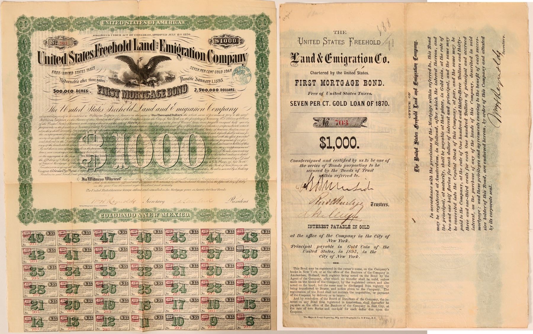 Ephemera from the United States Freehold Land and Emigration Certificate, incorporated in July 8, 1870 in Colorado (By Special Act of Congress), certificate number 703. Signed by C. A. Lumbard, and William H. Reynolds. Holland 1 25 revenue stamp. Printed by Major & Knapp Eng. Mfg. & Lith. Co. 71 Broadway, NY, size 11.25" by 7.75". Heavy folds with holes at intersections. Coupons 8 through 49 attached. Ornate border with an eagle vignette. Printed on top: "Incorporated by a Special Act of Congress of the United States. Approved July 8th, 1870." The United States Freehold Land and Emigration Company was established in 1869 to promote and encourage emigration to and establish settlements on the 500,000 acre Costilla Estate in the San Luis Valley, in the Territories of Colorado and New Mexico. State: Colorado City: Date: 1870