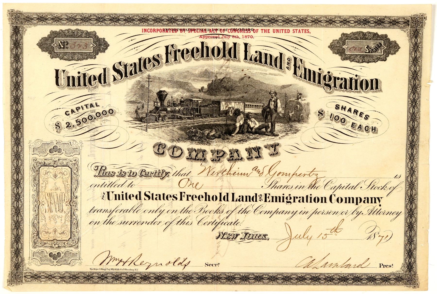 Inc. in Colorado. No. 323, issued for one share to Werthein and Gompertz on July 15th, 1871 in New York. Signed by president, C.A. Lambard and Secretary, William H. Reynolds. Not cancelled. Major & Knapp printer. Vignette of a steam locomotive passing by a group of workers next to a track. Pinholes, folds. 7.5 x 11.5" The United States Freehold Land and Emigration Company was established in 1869 to promote and encourage emigration to and establish settlements on the 500,000 acre Costilla Estate in the San Luis Valley, in the Territories of Colorado and New Mexico. Ken Prag Collection