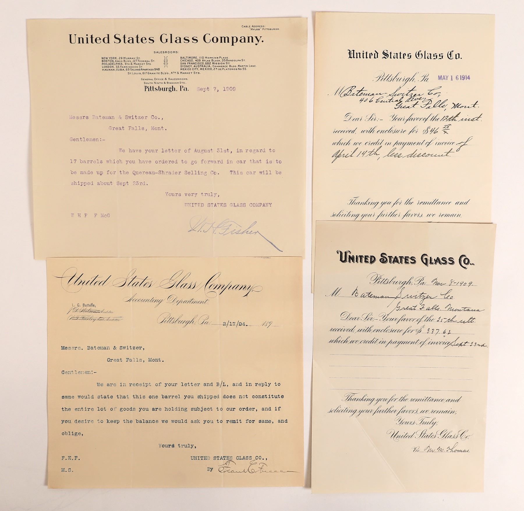 4 letters heads from United States Glass Co. c. 1894-1914 to Bateman and Switzer, Great Falls, MT.