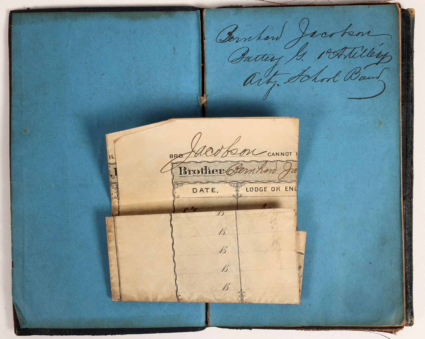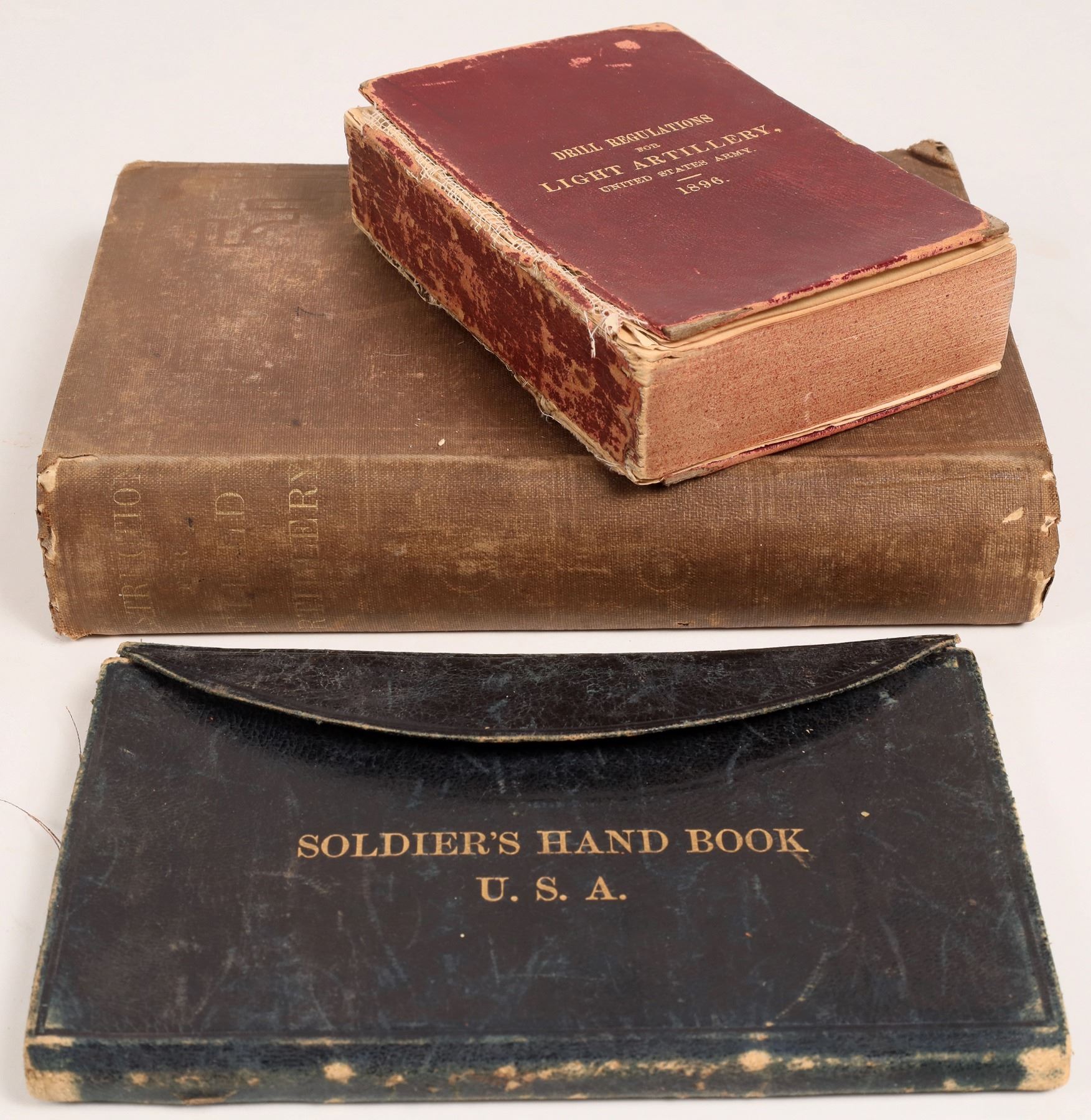 This lot holds three books: "Drill Instructions for Light Artillery United States Army 1896", pp.554 broken fragile binding. 3.5 in. X 5 in. "Instruction for Field Artillery, 1860, pp. 349, moderate foxing. 6in. X 8in. The third book is a "Soldier's Handbook" owned and signed by Bernard Jacobson Battery G Artillery/ assigned to the Artillery School Band. pp. 86. It includes expenses ledger. In this book and binder are the folded documents for Bernard Jacobson becoming a Free and Accepted Mason, an Odd Fellow, and his Honorable Discharge papers from the Army after 5 years service, 1891. 6.5in. X 4 in. From the Sherman collection.