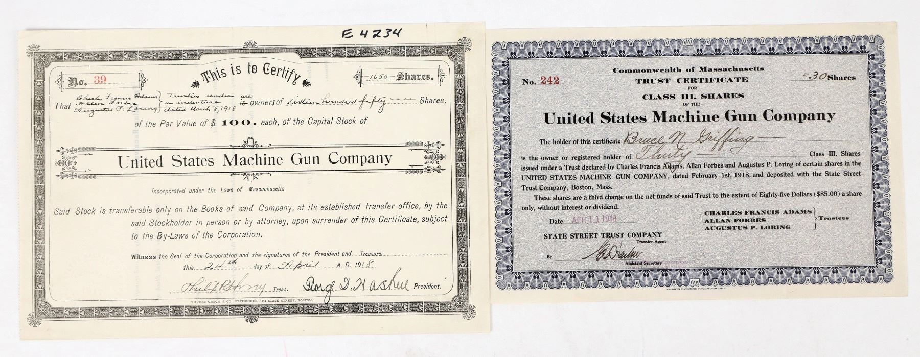 Two stock certificates issued by the United States Machine Gun Company in 1918.