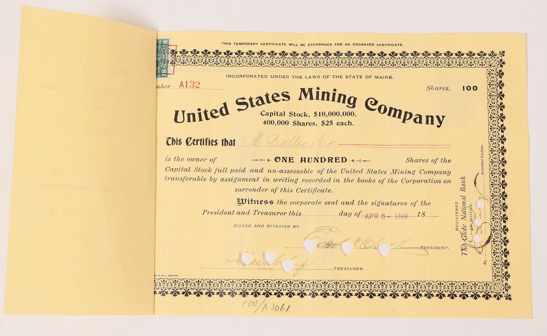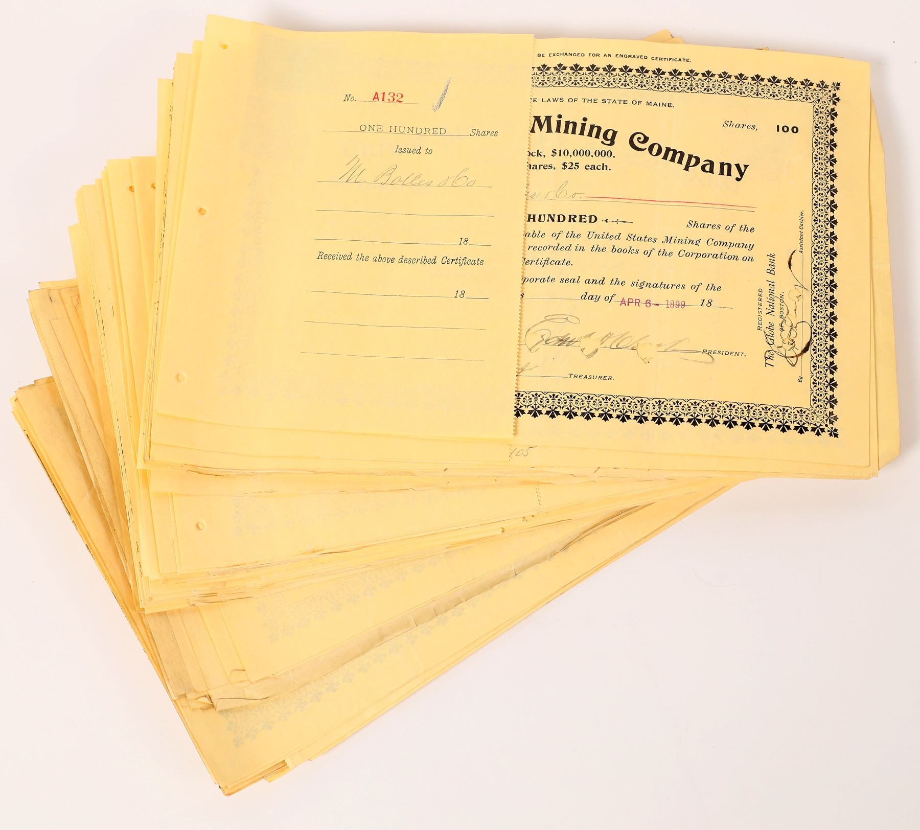 Lot of 100 stocks issued in 1899. All punch cancelled. All appear to have at least one adhesive revenue stamp. Black print on yellow paper. Inc. in Maine. Signed by president Edward Clark and the treasurer. This company was made up of a group consisting of Albert E. Holden of Salt Lake City and a group of Boston bankers and businessmen appropriately called the "United States Oil crowd." Holden and his father, Liberty E. Holden, had been prominent Utah mining men, with interests in the Bingham and Tintic districts dating back to the 1880's. By the late 1890's they had an extensive and profitable group of mining properties including the Old Jordan and Galena claims at Bingham, and the Centennial-Eureka Mine in the Tintic District. The new company, with a capitalization of $10 million in 400,000 shares at $25 par, constituted the largest, mining "deal" ever to be undertaken in Utah. Edward A. Clark, president of the United States Oil Company, was elected president of the new company and A. E. Holden appointed managing director. The company immediately began a full program of exploration and development, as the result of which considerable quantities of copper-bearing ores were revealed in both the Bingham and Tintic properties. The company, therefore, selected a site for the new smelter on the Jordan River at Bingham Junction (Midvale) south of Salt Lake City.