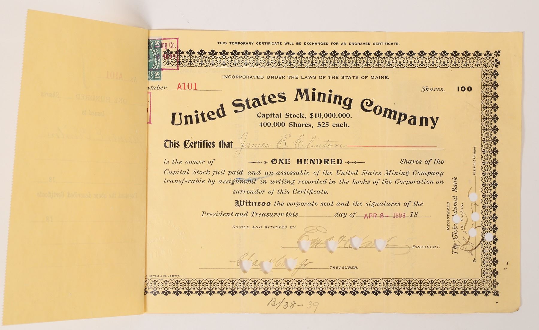 Lot of 50 stocks issued in 1899. All punch cancelled. All appear to have at least one adhesive revenue stamp. Consecutive groups. Black print on yellow paper. Inc. in Maine. Signed by president Edward Clark and the treasurer. This company was made up of a group consisting of Albert E. Holden of Salt Lake City and a group of Boston bankers and businessmen appropriately called the "United States Oil crowd." Holden and his father, Liberty E. Holden, had been prominent Utah mining men, with interests in the Bingham and Tintic districts dating back to the 1880's. By the late 1890's they had an extensive and profitable group of mining properties including the Old Jordan and Galena claims at Bingham, and the Centennial-Eureka Mine in the Tintic District. The new company, with a capitalization of $10 million in 400,000 shares at $25 par, constituted the largest, mining "deal" ever to be undertaken in Utah. Edward A. Clark, president of the United States Oil Company, was elected president of the new company and A. E. Holden appointed managing director. The company immediately began a full program of exploration and development, as the result of which considerable quantities of copper-bearing ores were revealed in both the Bingham and Tintic properties. The company, therefore, selected a site for the new smelter on the Jordan River at Bingham Junction (Midvale) south of Salt Lake City.
