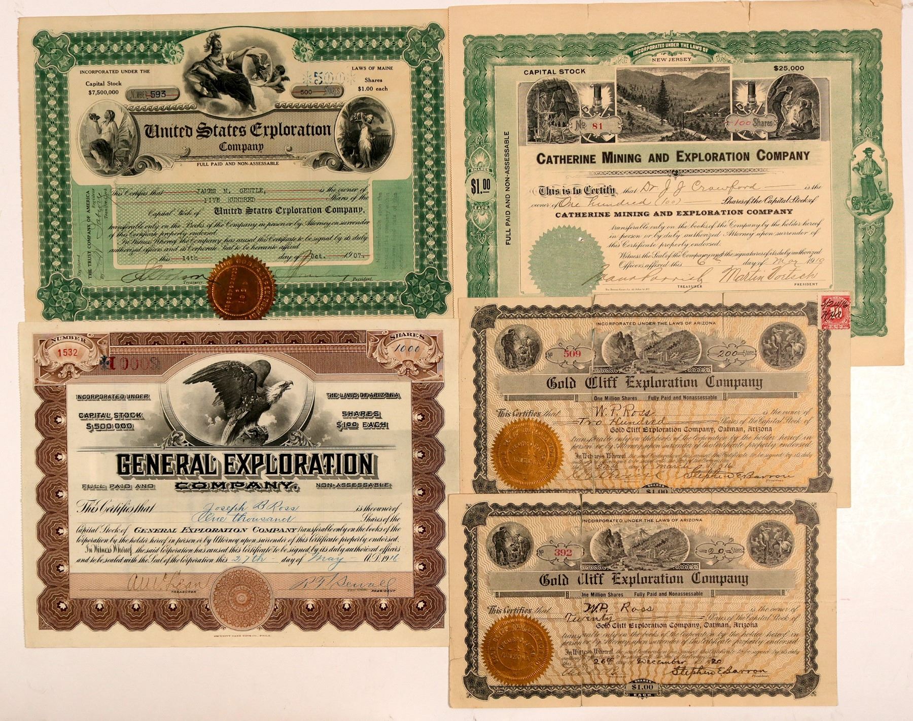 Lot of five. 1-2) Gold Cliff Exploration Company. 3) Catherine Mining and Exploration Company. 1910. Nice vignettes. 4) General Exploration. 5) United States Exploration Company, 1907. Three vignettes including allegorail woman with magic lamp. Ken Prag Collection