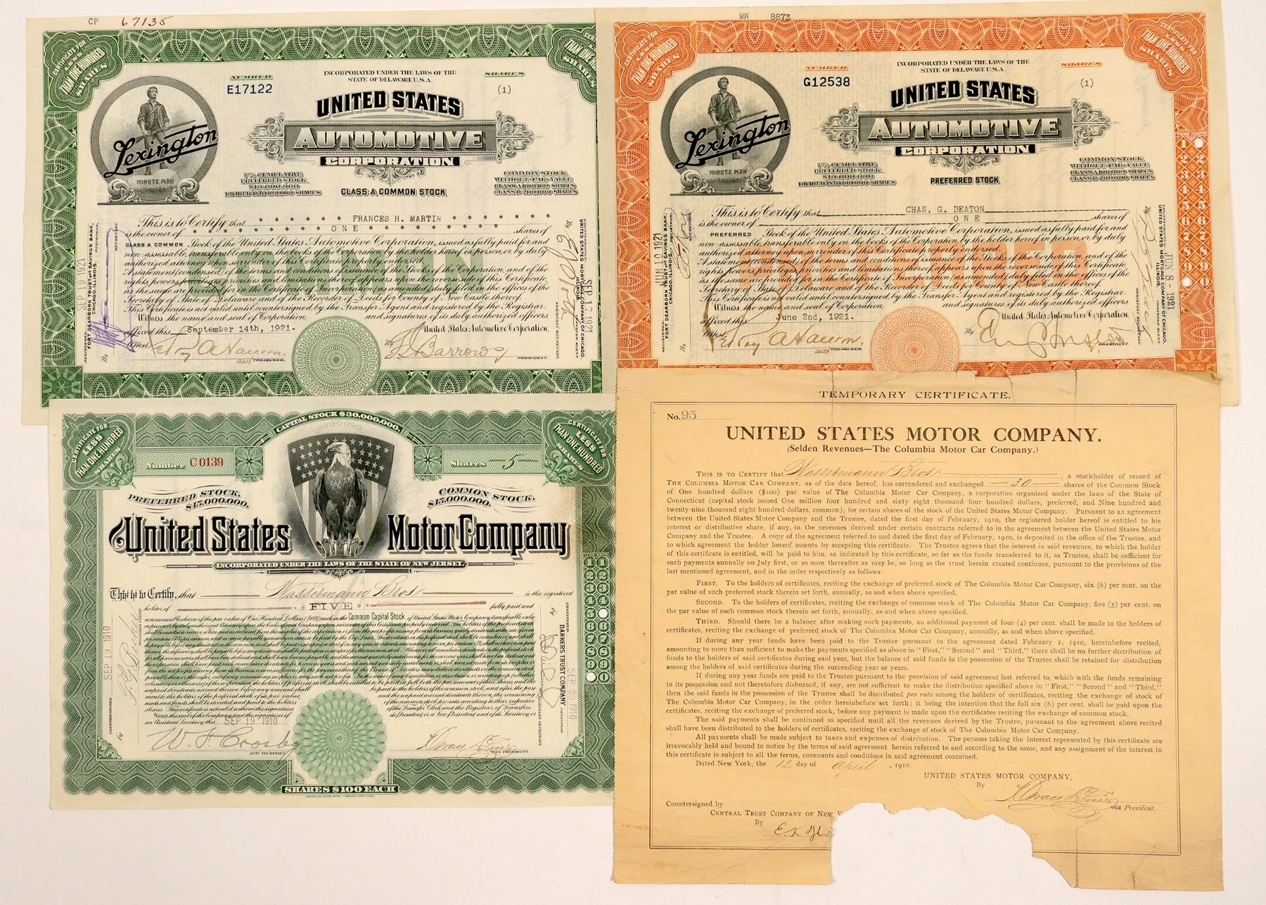 Lot of 4. Two different companies with "United States" in their name. 1) United States Automotive Corporation. Two varieties issued in 1921. Green or orange border, vignette of The Lexington Minuteman monument representing militia Captain John Parker. Not cancelled. Folds. 2) United States Motor Company. Two different: temporary stock (1910, poor condition) and 1910 (green border, eagle and shield vignette, not cancelled). Ken Prag Collection