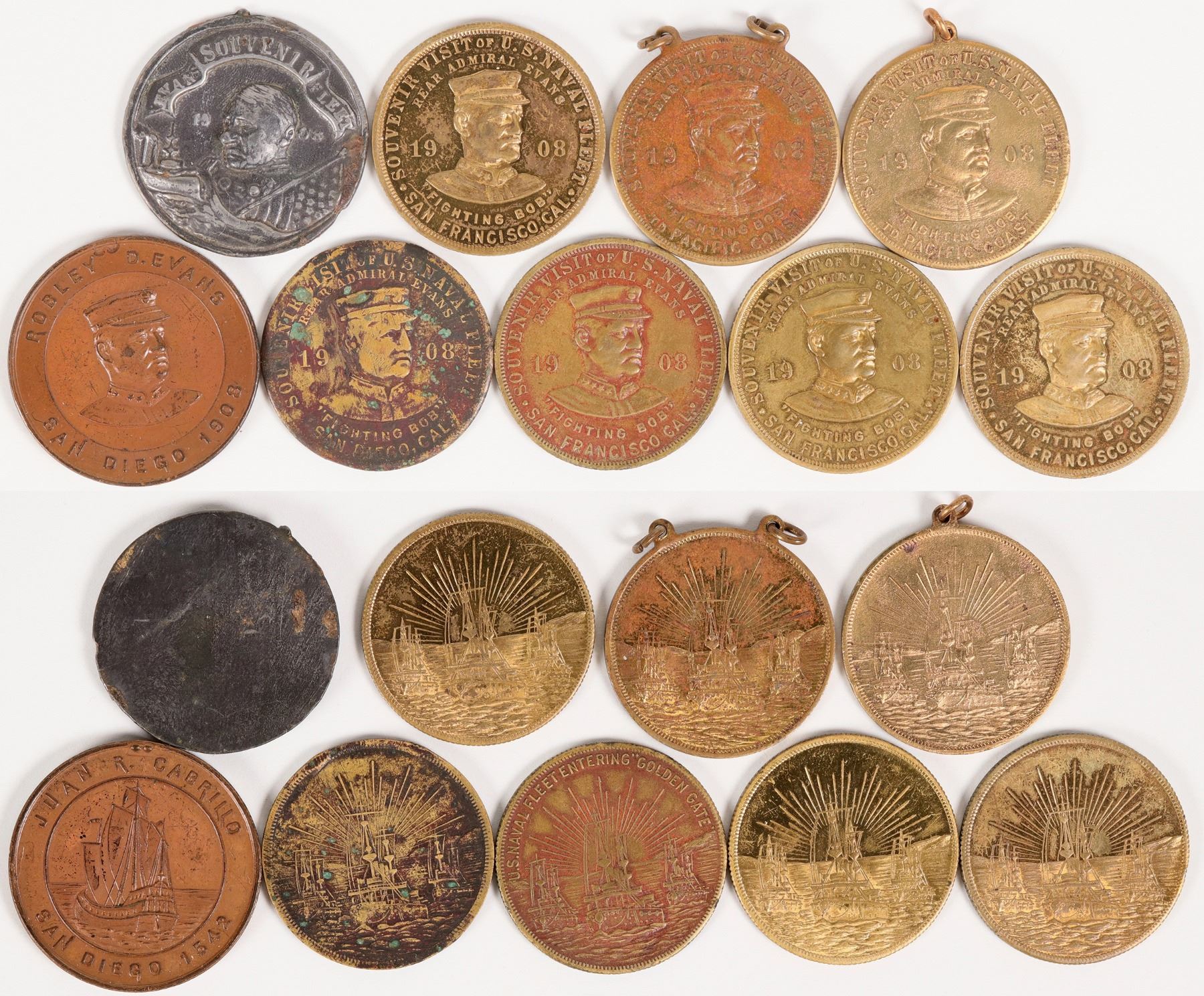 Lot of nine examples of HK 351 & 352 celebrating Admiral Robley D. Evans ("Fighting Bob") visit to San Diego on the Great White Fleet's voyage around the world to demonstrate American might in 1908.
