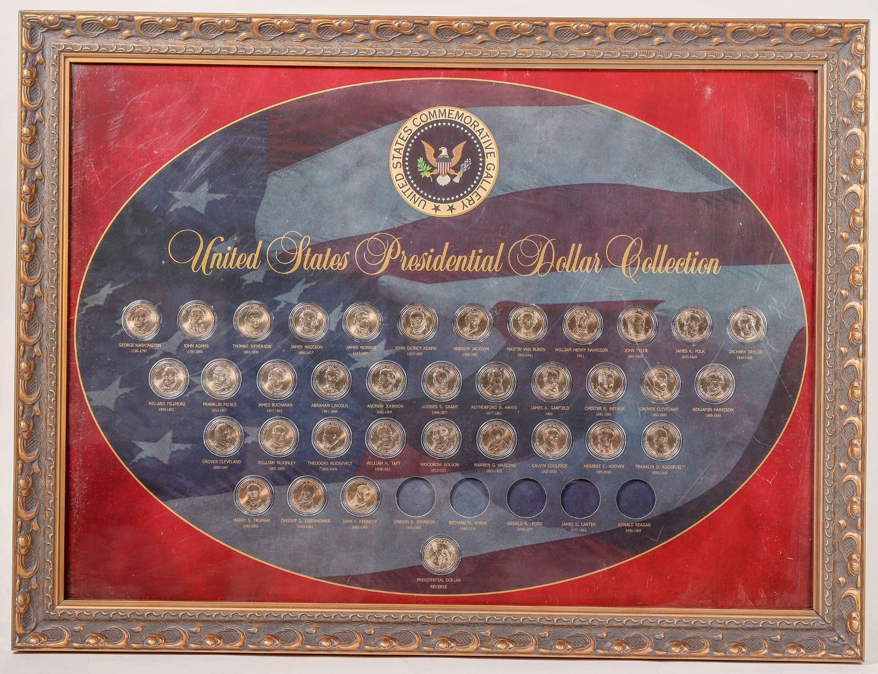 Issued by the United States Commemorative Gallery, a 27 x 20 inch framed presentation of the U. S. Presidential dollar coins minted between 2007-2016. The frame has 38 brilliant uncirculated coins, missing only the last five presidents. George H. W. Bush's coin was made posthumosly, but there's no spot for him.