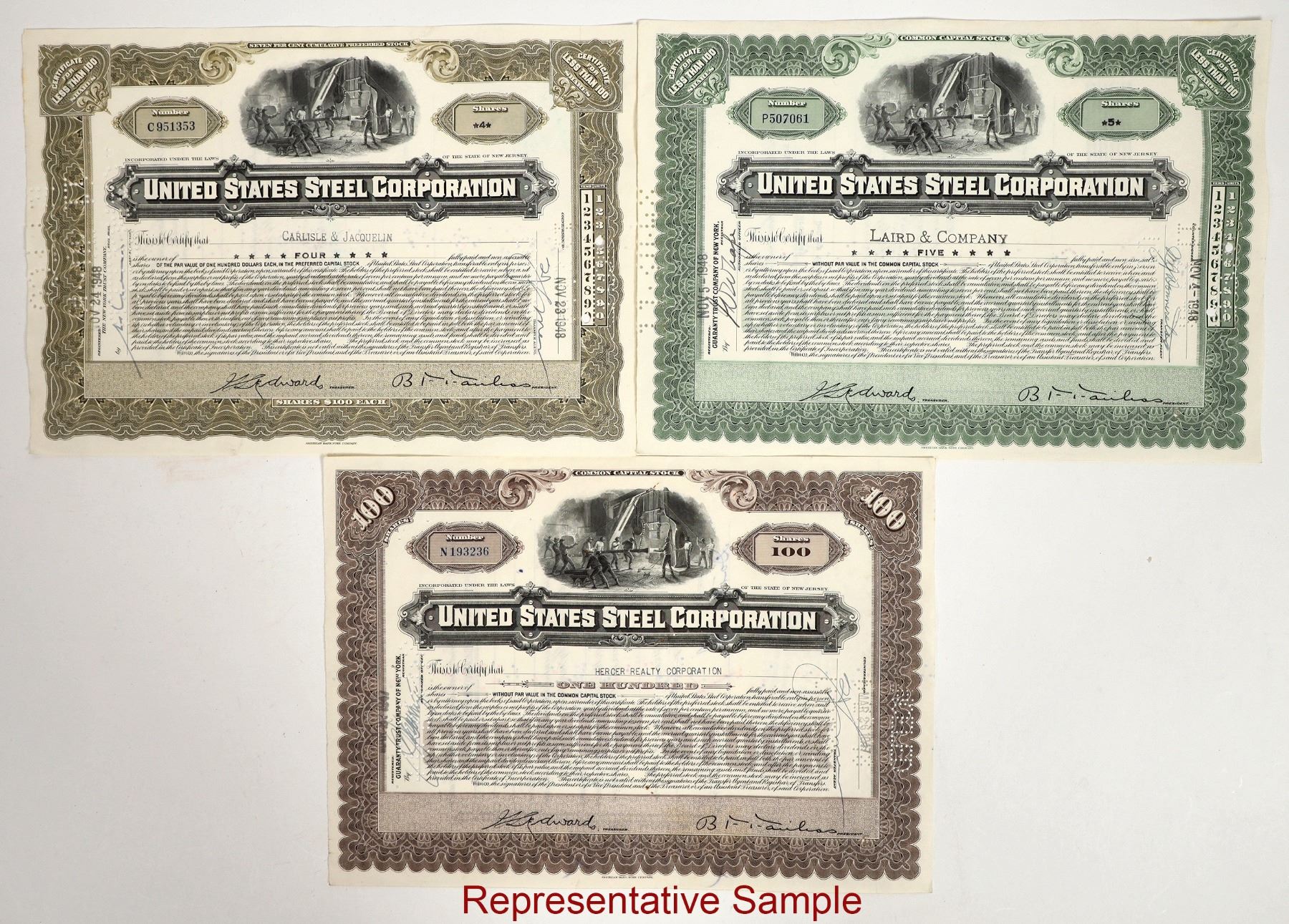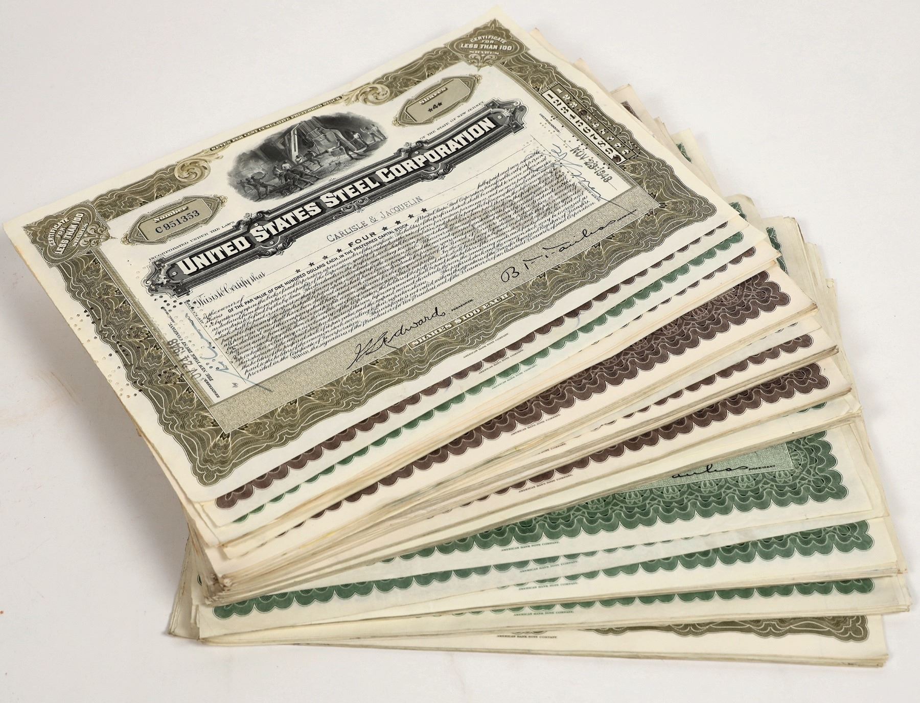 There are three denominations of stocks from United States Steel Corp.; there are fifteen preferred stocks (olive green),eighty-five common stocks less than 100 shares (green), and over eighty shares of common stocks at 100 shares (brown). Please see photo for details.