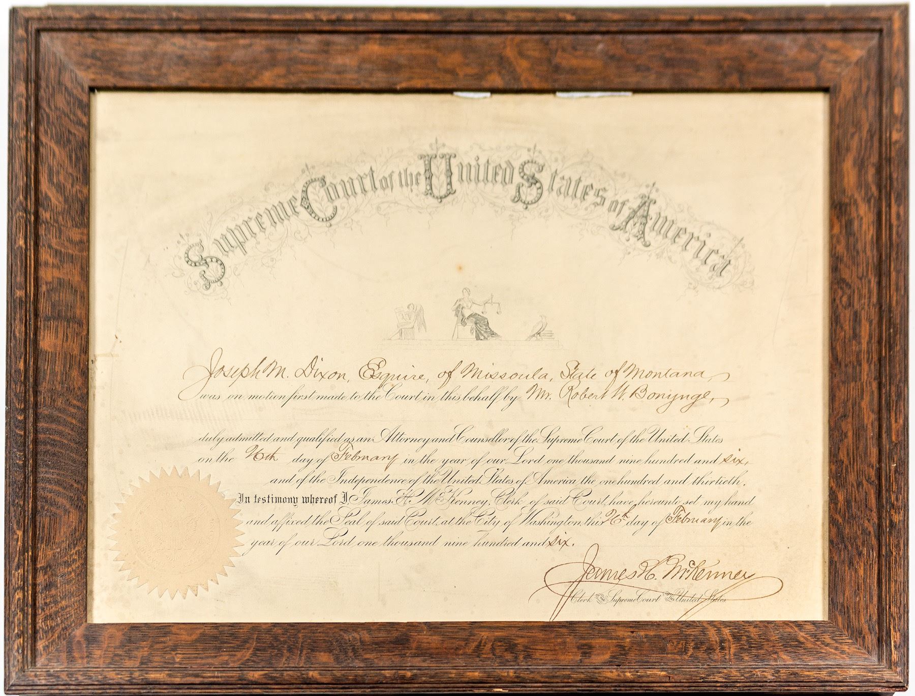 Framed appointment of Joseph M Dixon as an attorney and counselor of the Supreme Court of the United States. In 1902 and 1904 Dixon won congressional races, and in 1907 the Montana legislature chose him for a U.S. Senate seat. He became an ardent admirer of President Theodore Roosevelt, and joined the progressive wing of the party, fighting the conservatives. He unsuccessfully ran for reelection in 1912, but that year, he was the campaign manager for Roosevelt and chaired the National Progressive Convention that nominated Roosevelt on the third-party Progressive Party ("Bull Moose") ticket as the GOP split. Out of office, Dixon returned to Montana to look after his newspaper properties, and to battle the Amalgamated Copper Company, the behemoth that dominated both political parties through its corrupt spending. He finally sold his newspapers, and they were taken over by Amalgamated. In 1920, Dixon ran for Governor of Montana, and, following farmer unrest that weakened the copper company, Dixon was carried by the national Republican landslide into office as governor, defeating Democratic nominee Burton K. Wheeler comfortably. Although Dixon had many reform proposals, he was unable to enact them because of the severe economic depression in the state, and the systematic opposition of Anaconda Copper. In 1929 he was appointed First Assistant Secretary of the Interior, and served in that position until 1933.[7] In 1930, he was involved with a project to develop water power on theFlathead Indian Reservation, and with it, a complex network of water rights for the Reservation.