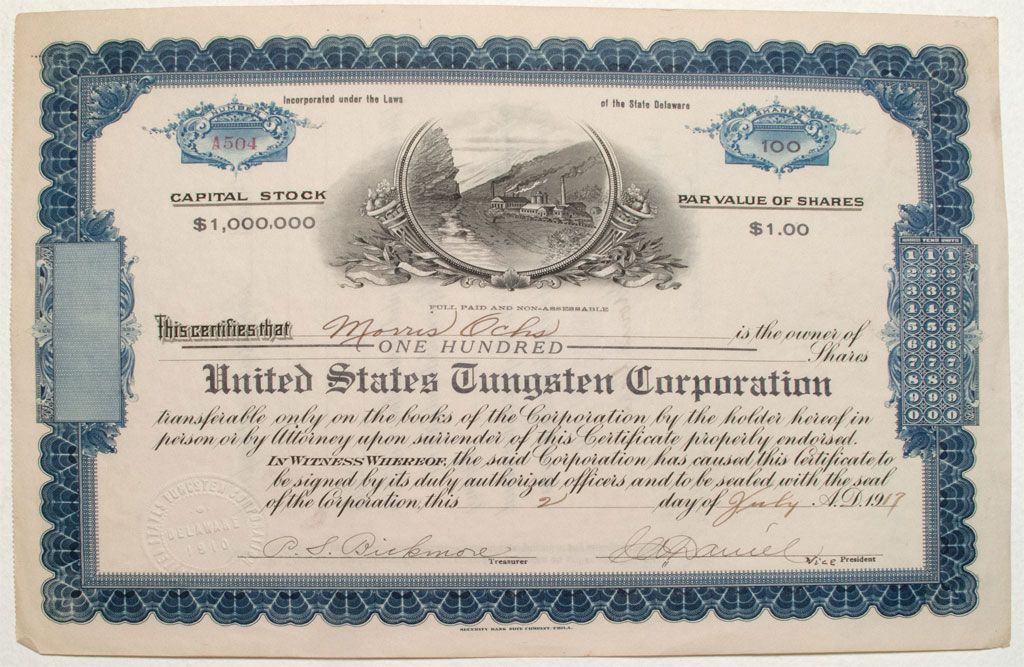 Certificate issued in 1917 to Morris Ochs, signed by J.C. Daniels as vice president. Inc. in Delaware. Tungsten claims were developed in 1900 near Minerva on the west flank of the Snake Range and the tungsten district was organized near the Hub mine, 9 _ miles from Minerva. The United States Tungsten Corporation built a fifty-ton concentrator in the Hub basin which produced a recorded $670,000 through WWI. Below the mill, the town of Tungsten Mines had a post office for one year between 1916 and 1917. The certificate has a nice mill site vignette and is in excellent, Uncancelled condition. Security Bank Note, Phila. Printer. Date 1917 Tungsten Mines, NV hwac 8749