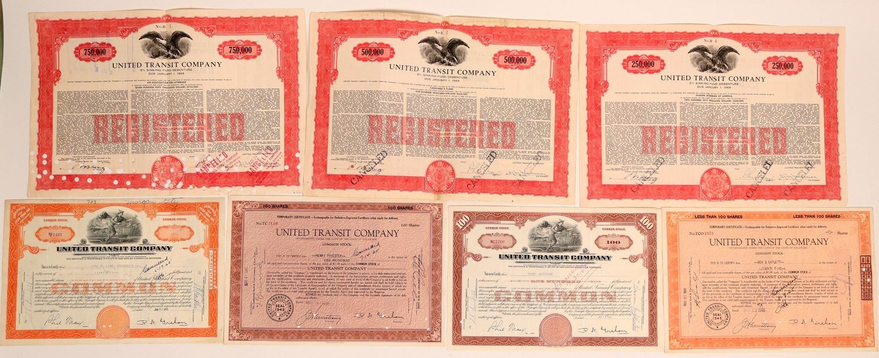 7 certificates. Incorp. 1945 New York. The United Transit Company (UTC) took over the United Electrical Railways Company (UER) in 1952. 1. Three bonds : #4 -$250,000, #2- $500,000 and # 1-$750,00. All red, eagle vignette I/C, 5% Sinking Fund. Issued Jan 1, 1954. 2. Two temporary certificates : #1973 9Orange) and #TC2110 (Brown), Both no vignette, issued May 1946. American Bank Note Co. 3. Two certs: #NC8866 (Brown) 100 shares and #NC1401(Orange) 10 shares. Both vignette Mercury running l-r New York background. American bank Note Co.