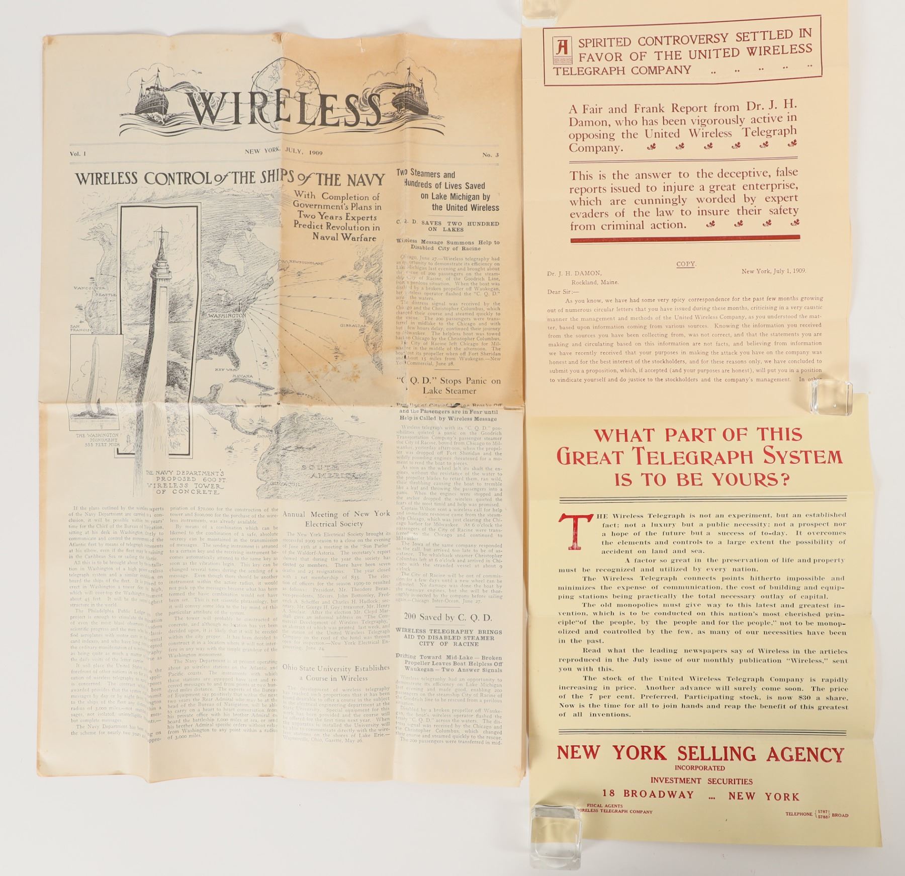 United Wireless Telegraph Company promotional material, including flyer advertising stocks, reprinted correspondence between the company and an auditor, and a "Wireless" gazette or newspaper-like publication. Each piece is folded 3-4 times. Correspondence and flyer measure approximately 9.5x12", and newspaper measures 13.5x19.75" when unfolded. Notable toning on about 1/4th of the newspaper front page. Where the folds of the newspaper form corners, there is some friction damage, wearing a small hole in the paper, about .3" in length. Otherwise good condition. See photo.