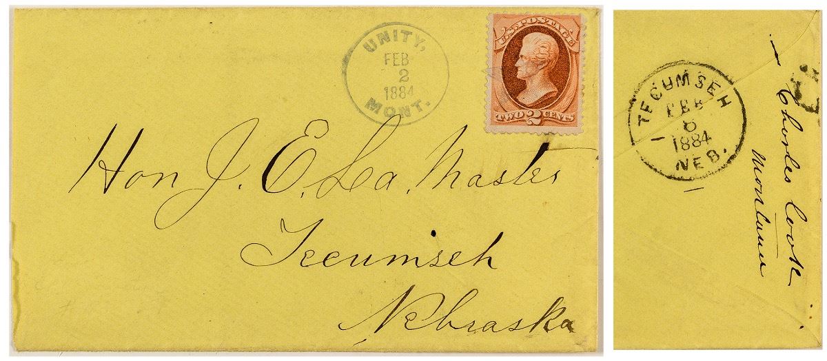 Only two manuscript covers listed in Shellen & Dunn. This is a strong circle cancel. Sender was Charles Cook. Post office was open from 1880 - 1912. (Svoboda Collection) City: Unity State: Montana Date: 1884 HWAC# 27972