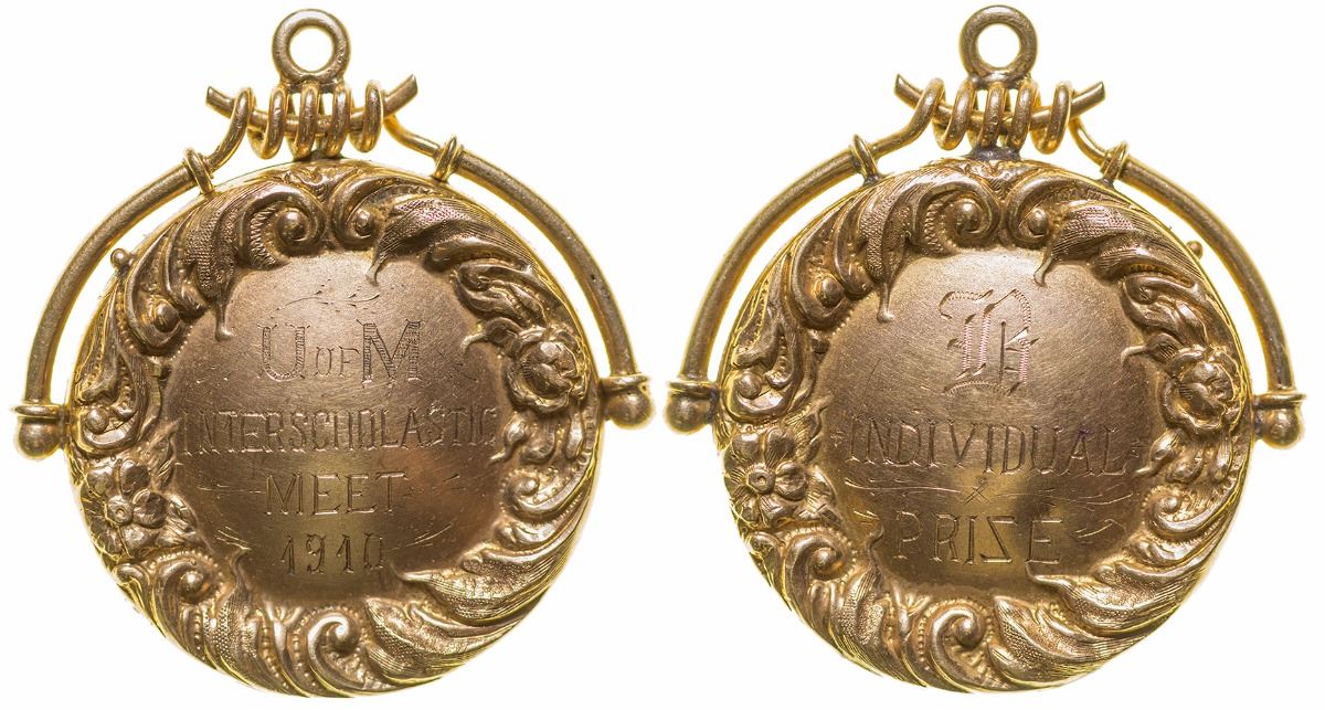 14K gold. University of Montana Interscholastic Meet, 1910. Individual prize. Beautifully embossed around edge and made to hang on chain. State: Montana City: Missoula Date: 1910 FHWAC#: 41570
