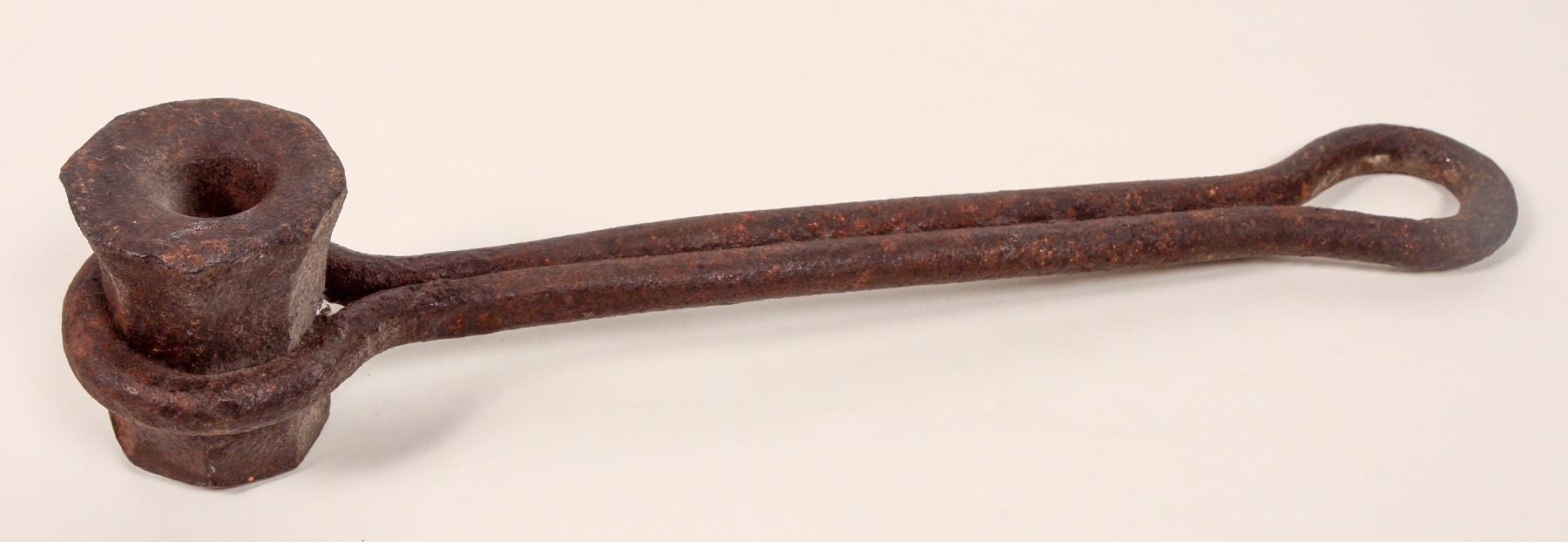 Very unusual tool, clearly made for melted metal, found next to the Sierra Nevada Mine on the north end of the Comstock. About 14" long. We have never seen one of these before.