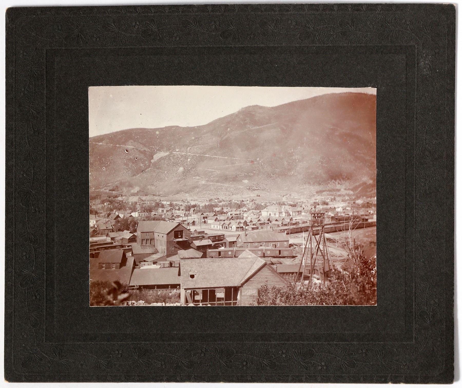 Birds' eye view of an unknown Colorado town, c. 1900. This town is not Siver Plume, Georgetown, Empire, or Golden. The photograph itself is 4 x 3 inches. Mounted, the overall size is 6.25 x 5.25 inches. Good condition.