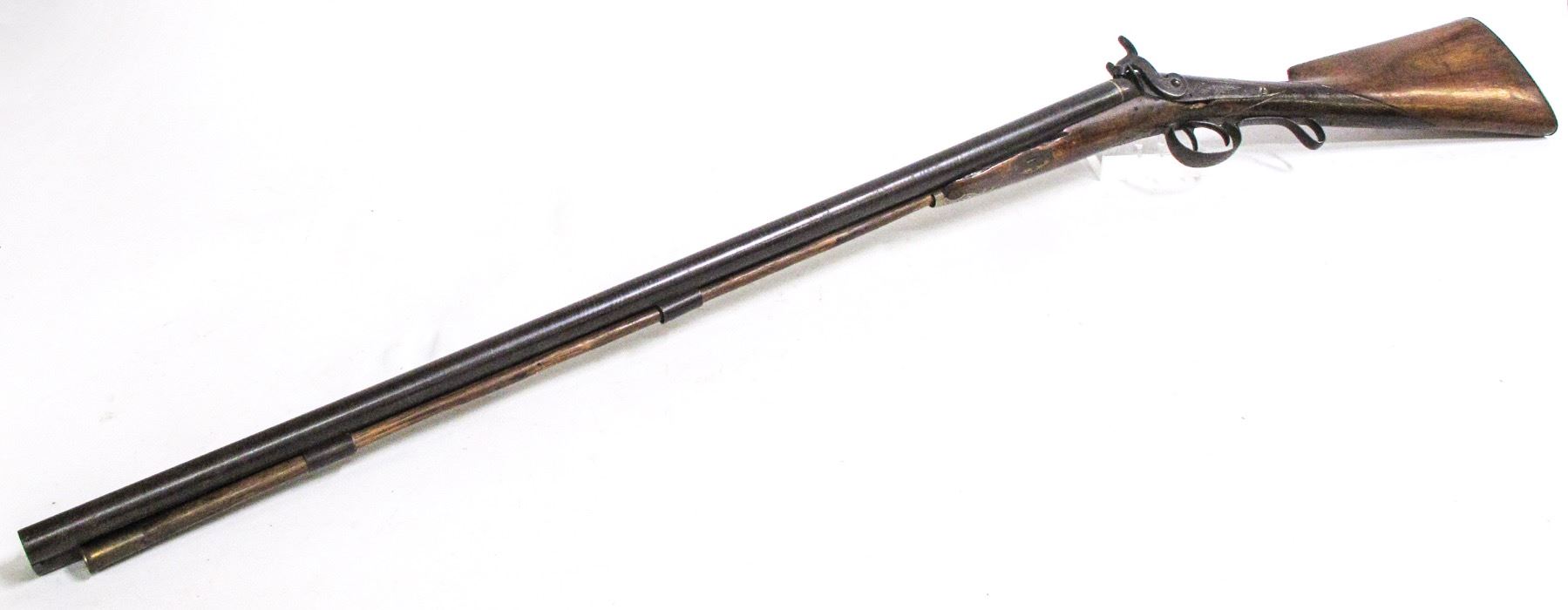 Beautiful and rare 1830's percussion shotgun with excellent silver inlays, nice engraving and beautiful pattern Damascus barrels. Straight stock with iron trigger guard/pistol grip. Original ramrod, with excellent wood and minor of-the-period repairs. Matching engraved hammers, twin triggers and gold inlays on the breach end of the barrels’ metal butt piece. Overall a beautiful example of pre-breach loading shotgun design. Excellent functioning mechanism. 32” 16 ga. barrels. Overall nice piece of early Americana. State: City: Date: ID# 45744