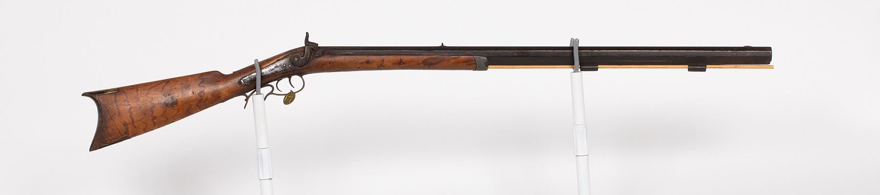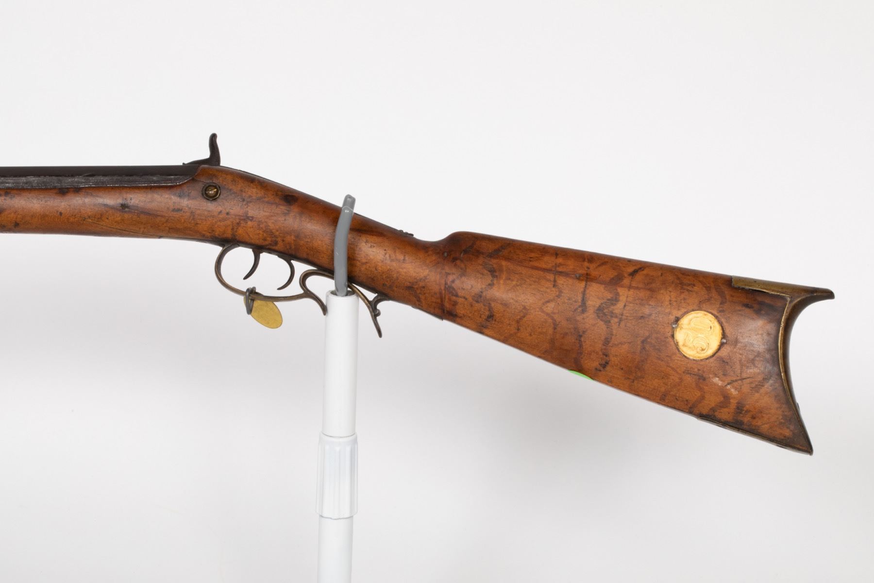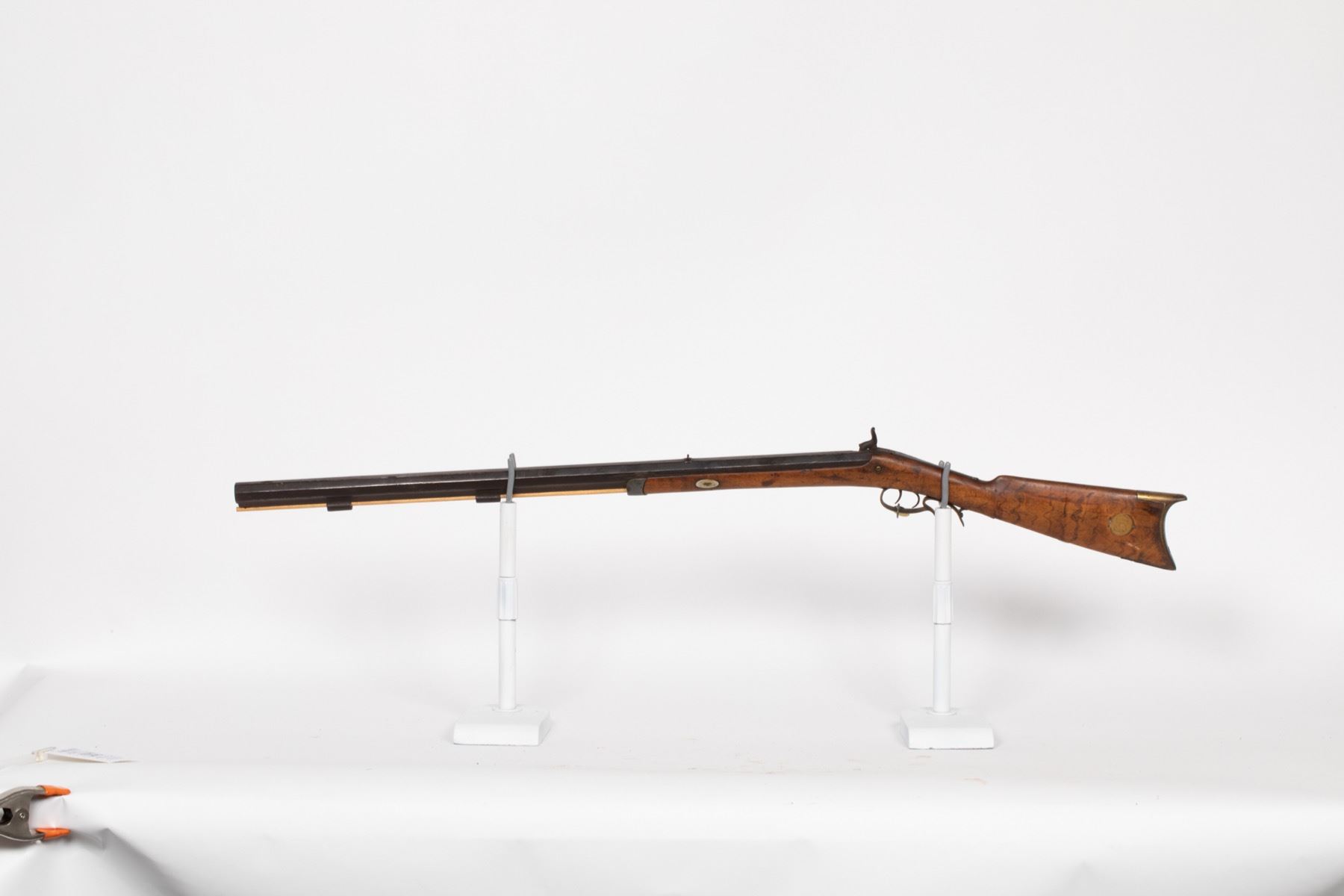 This is a back-action percussion rifle about .54 cal. The stock has been artificially striped. SN: N/A, JMD Oval Tag: 945, Condition: Fair, >
