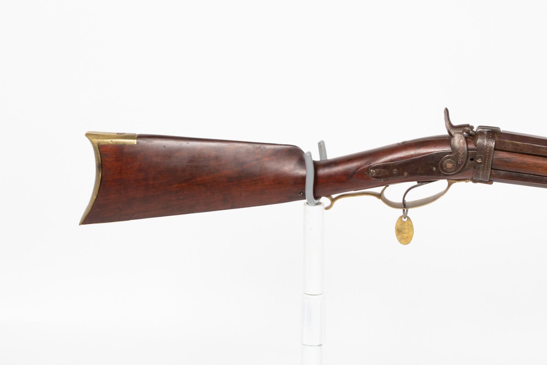 This is a swivel breach shotgun, maker unknown, back-action percussion lock in good condition. The barrels are octagon to round with wedding bands. SN: N/A, JMD Oval Tag: 9117, Condition: Good, >