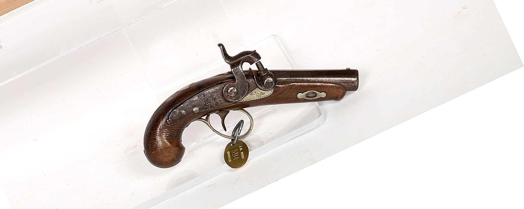 This is a derringer, maker unknown. It is about .37 cal. A single-shot percussion pocket gun. This is the same model of pistol that John Wilkes Booth used to assassinate President Lincoln. It has a 3 in. barrel and German silver inlays. SN: N/A, JMD Oval Tag: 594, Condition: Excellent, >