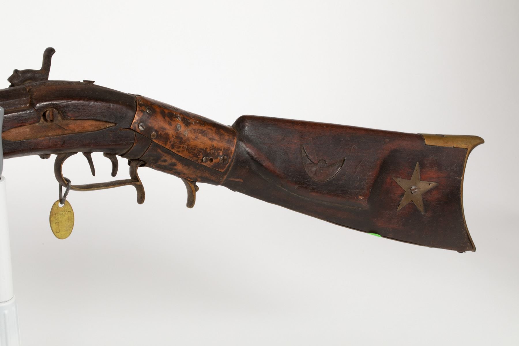 Golcher lock. Ohio Origin. Major stock repair at wrist. Missing brass inlays. Very Early American Kentucky Rifle dates from the 1830s, 40s or earlier SN: N/A, JMD Oval Tag: 925, >