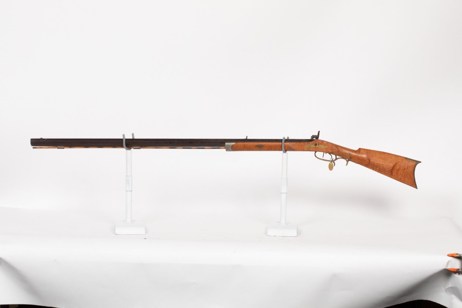 This rifle is a half-stock Kentucky rifle. Maker unknown, about .32 cal. A marriage of parts with an excellent stock of maple. SN: N/A, JMD Oval Tag: 6969, Condition: Excellent, >