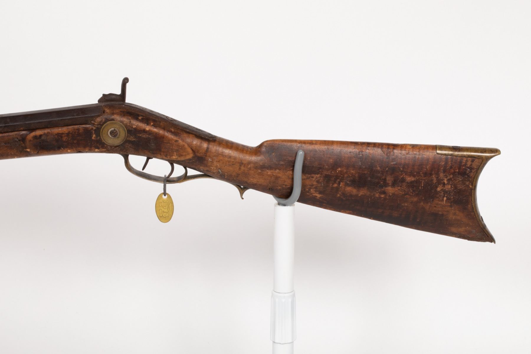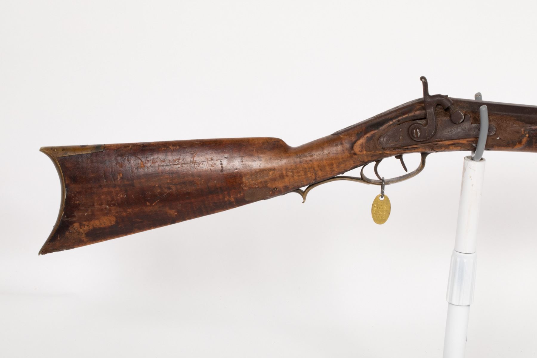 This is a half-stock Kentucky rifle made in Ohio. at .36 cal. poor condition. SN: N/A, JMD Oval Tag: 1942, Condition: Poor, >