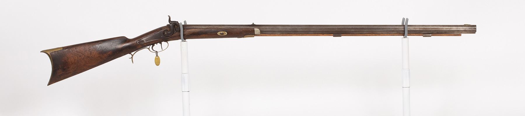 This rifle is half-stock Kentucky rifle at .38 cal. Walnut stocked with a beautiful German silver inlay in the cheek piece of an antlered deer. SN: N/A, JMD Oval Tag: 1998, Condition: Good, >