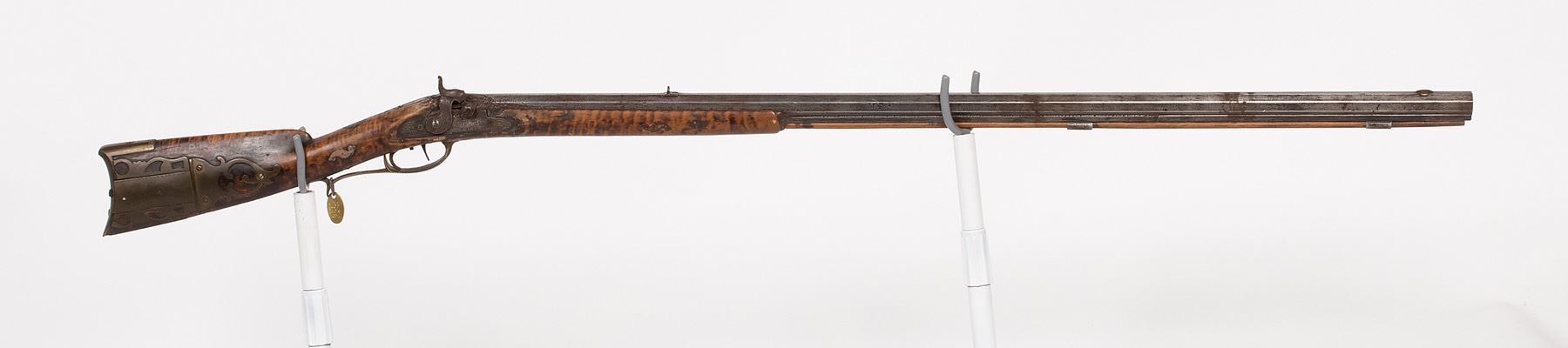 This a half-stock Kentucky rifle in .34 cal. Maker unknown. Thought to be a Maryland gun due to the "Q" design patchbox. In a tiger-stripe maple stock in fair condition. SN: N/A, JMD Oval Tag: 7338, Condition: Fair, >