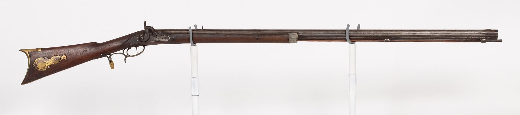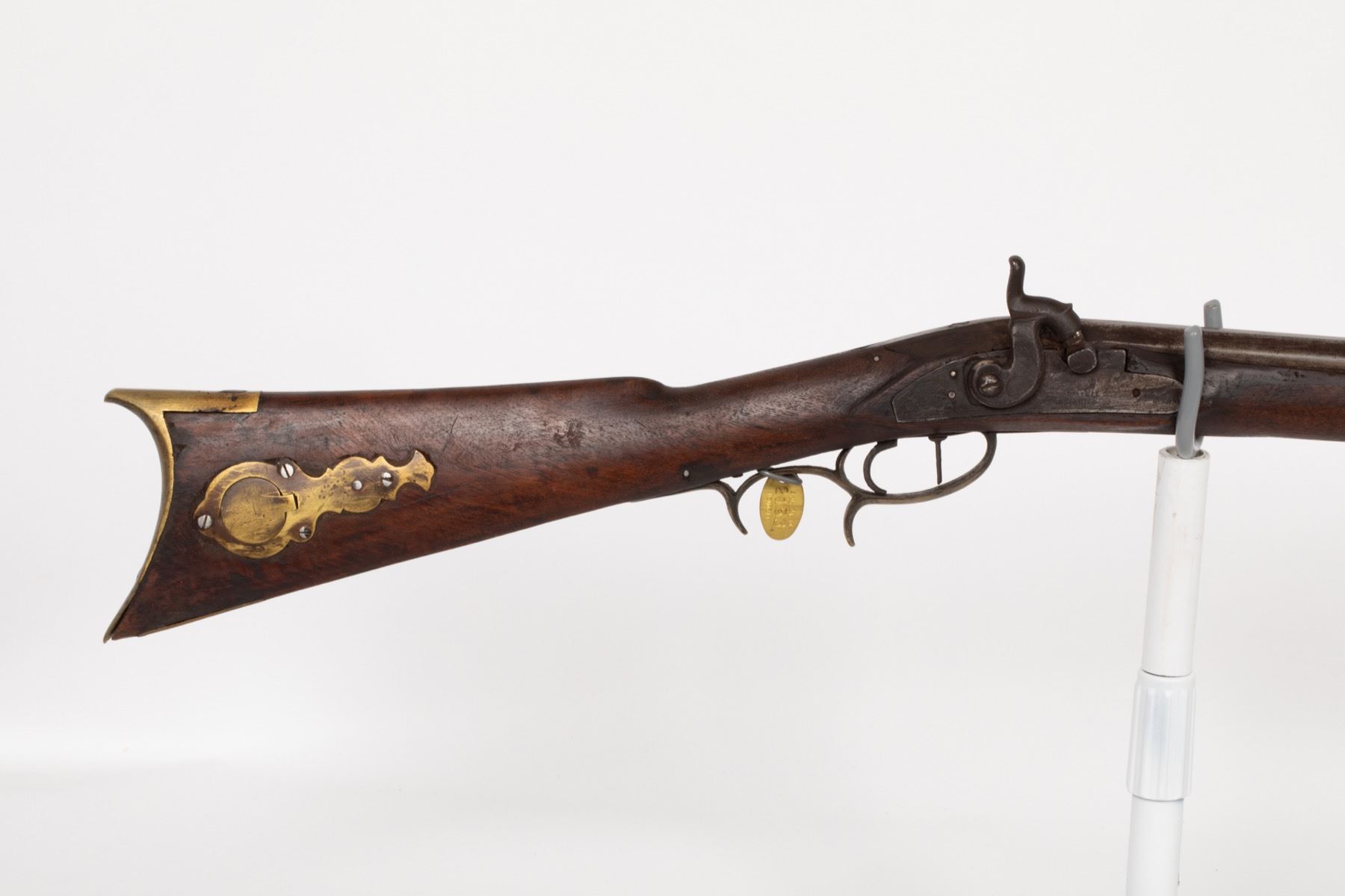 This is a half-stock Kentucky rifle; maker unknown, Henry Parker percussion lock about .36 cal. Ohio origin. SN: N/A, JMD Oval Tag: 2153, Condition: Fair, >