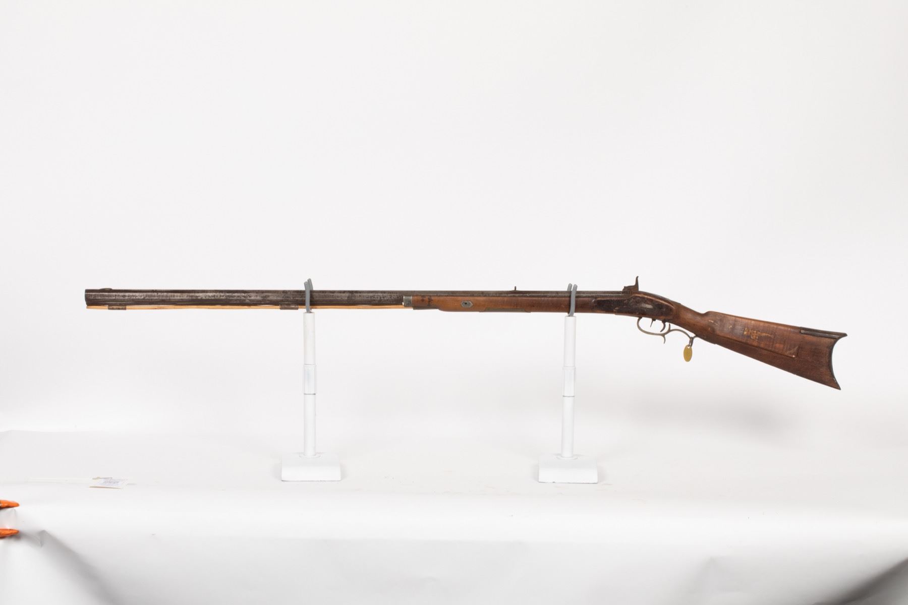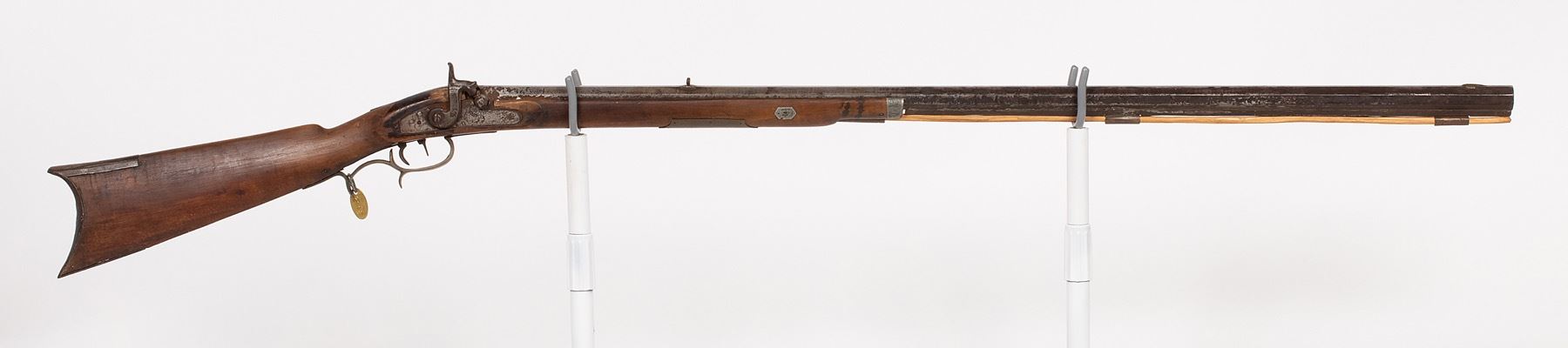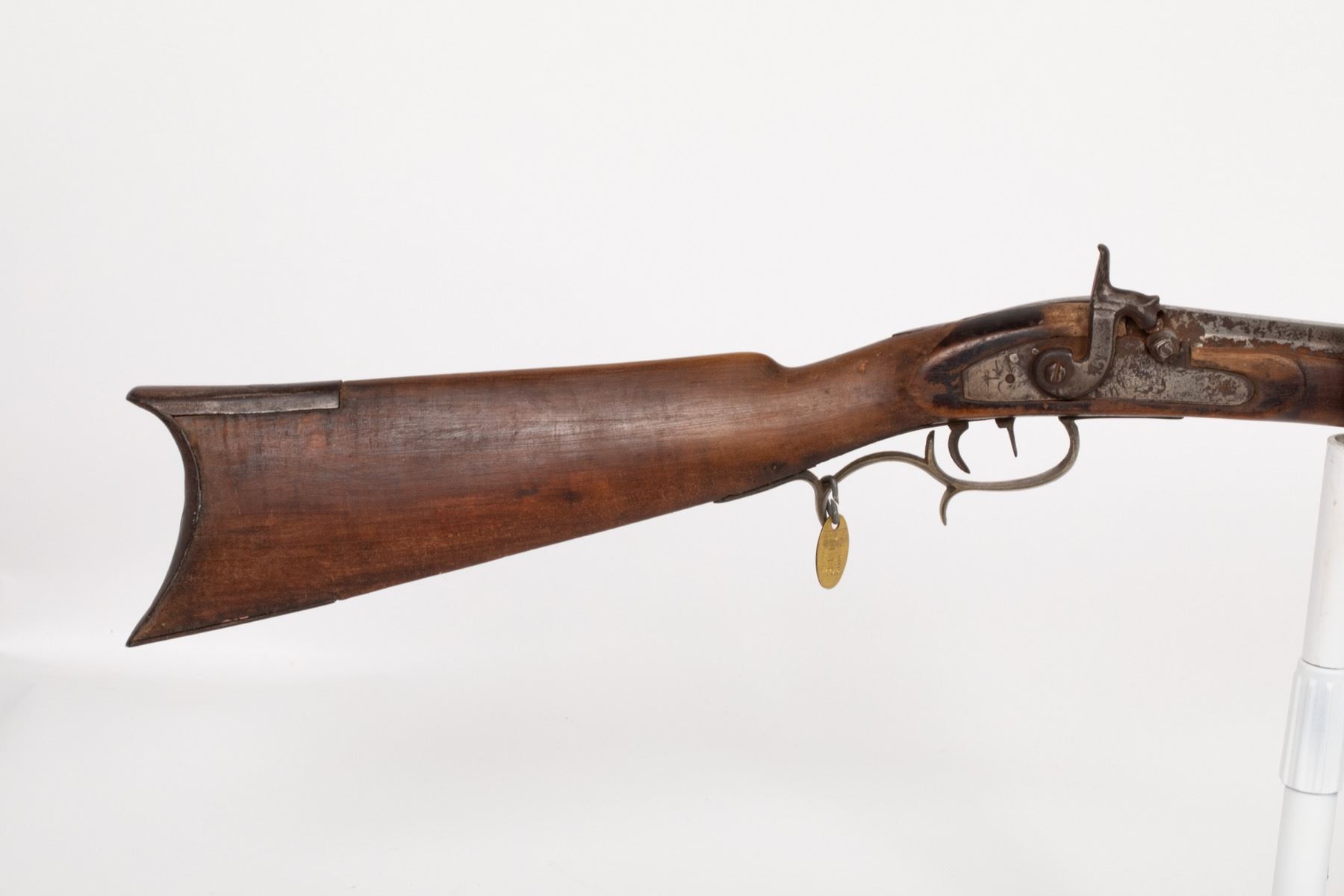 This is a half-stock Kentucky rifle. Maker unknown, percussion half-stock, about .32 cal. Condition fair. SN: N/A, JMD Oval Tag: 2118, Condition: Fair, >