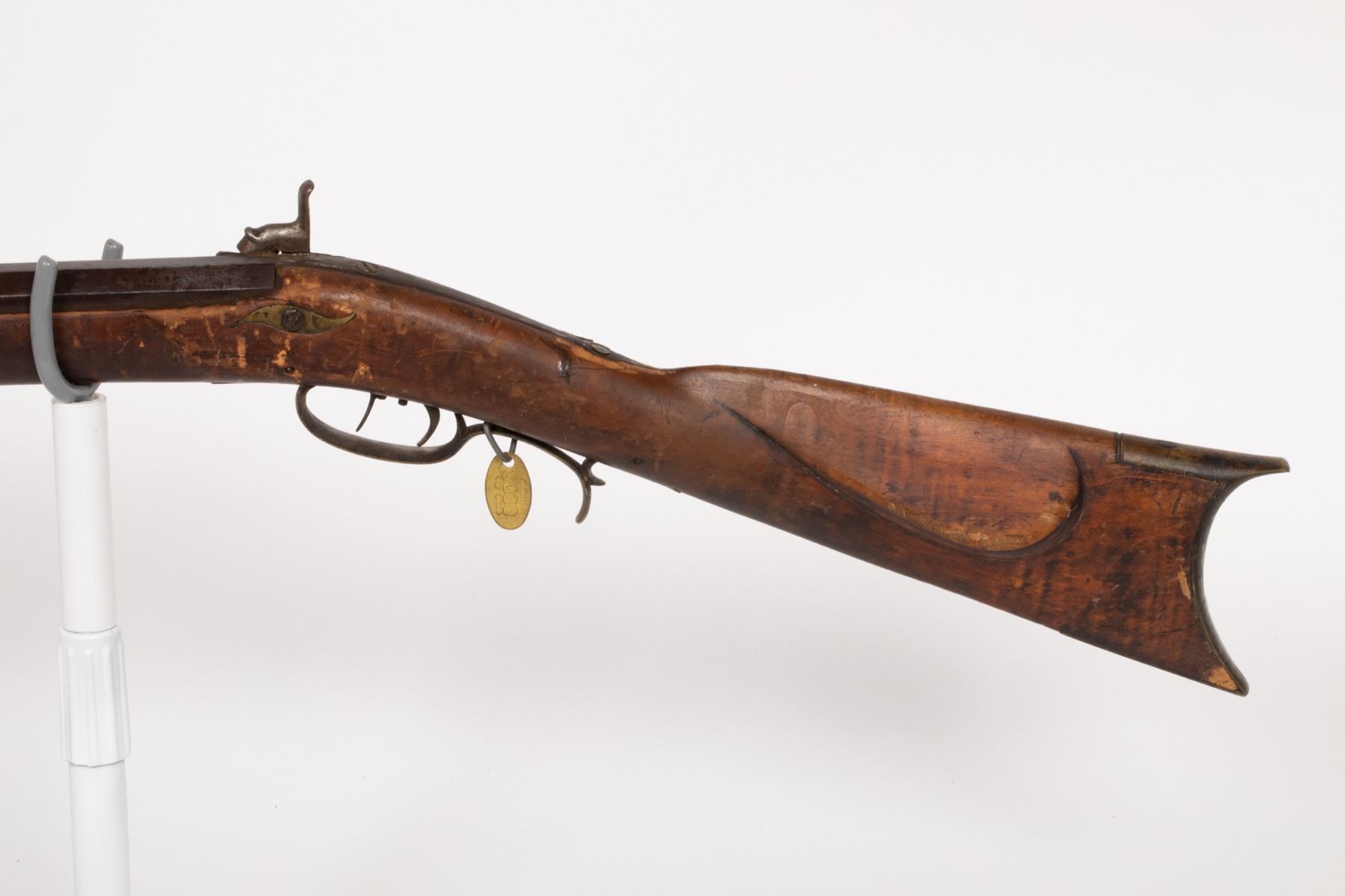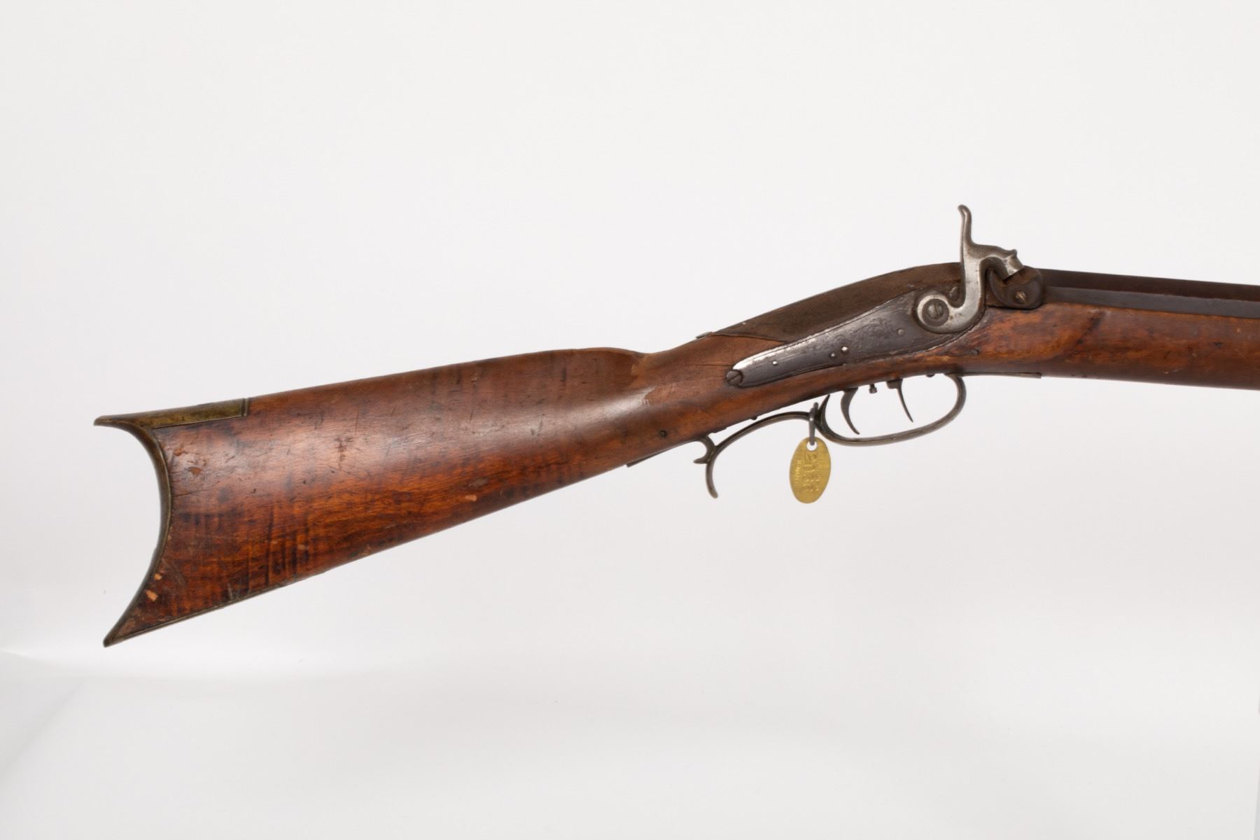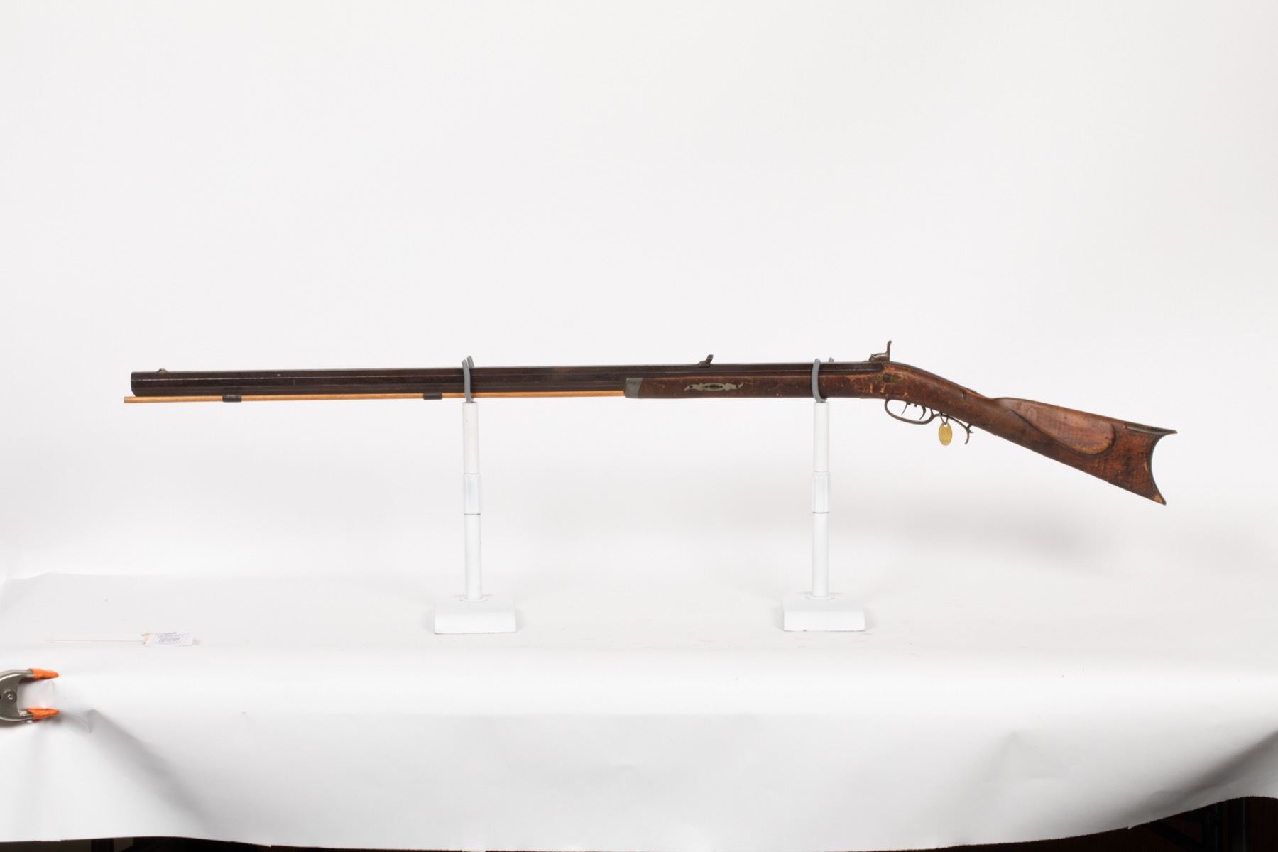 This is a half-stock Kentucky rifle in .42 cal. German silver inlays at the barrel mount. Back-action lock. SN: N/A, JMD Oval Tag: 2036, Condition: Fair, >