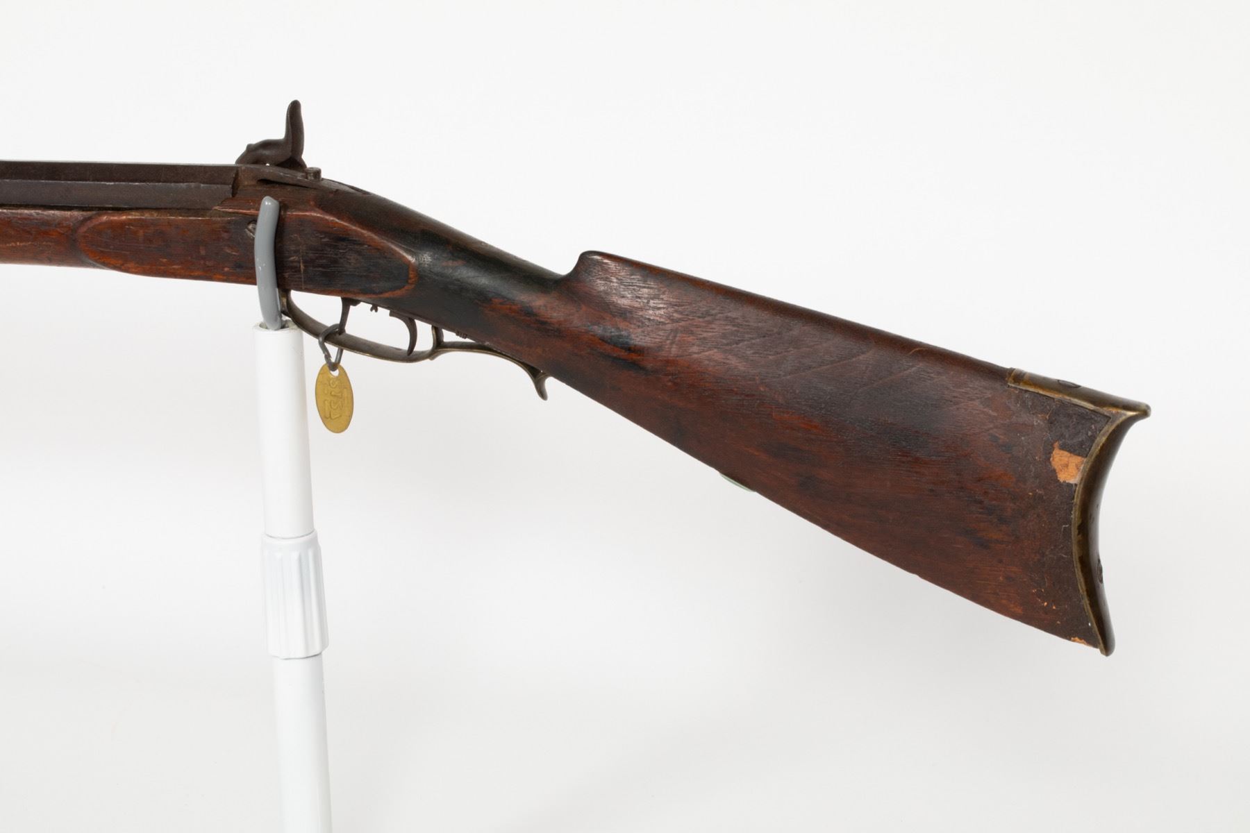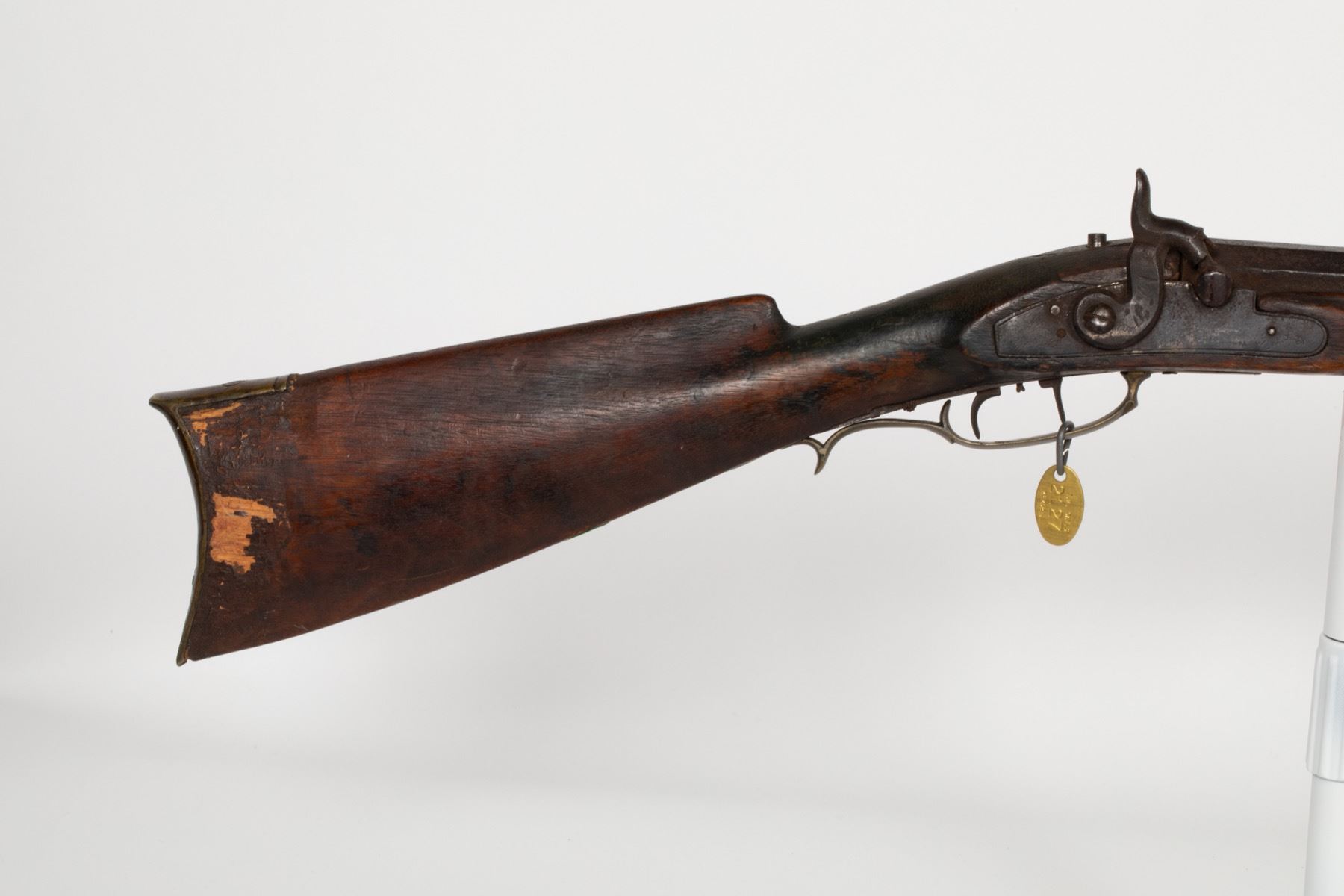 This is small bore .36 cal. full-stock Kentucky rifle in fair condition. SN: N/A, JMD Oval Tag: 2127, Condition: Fair, >
