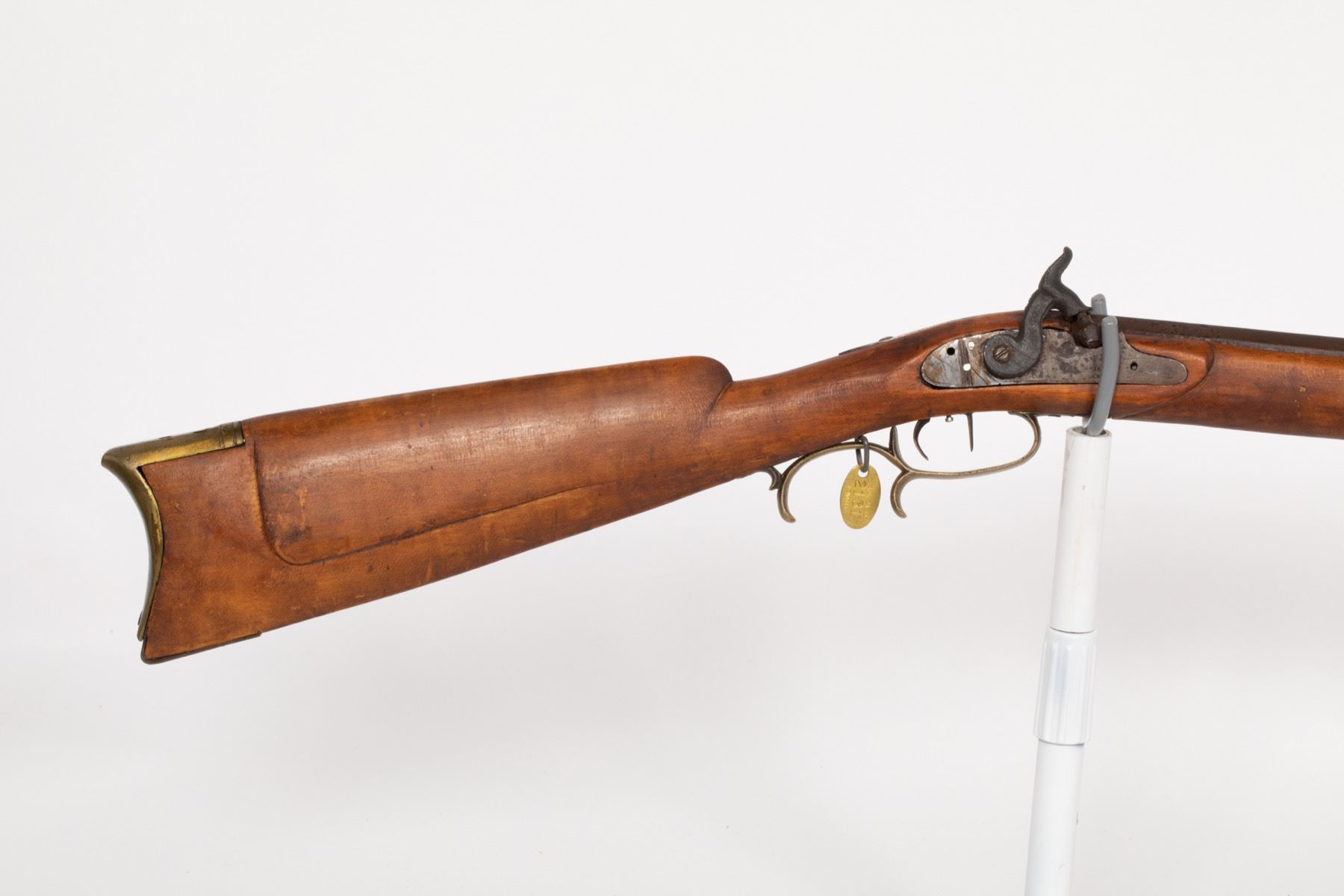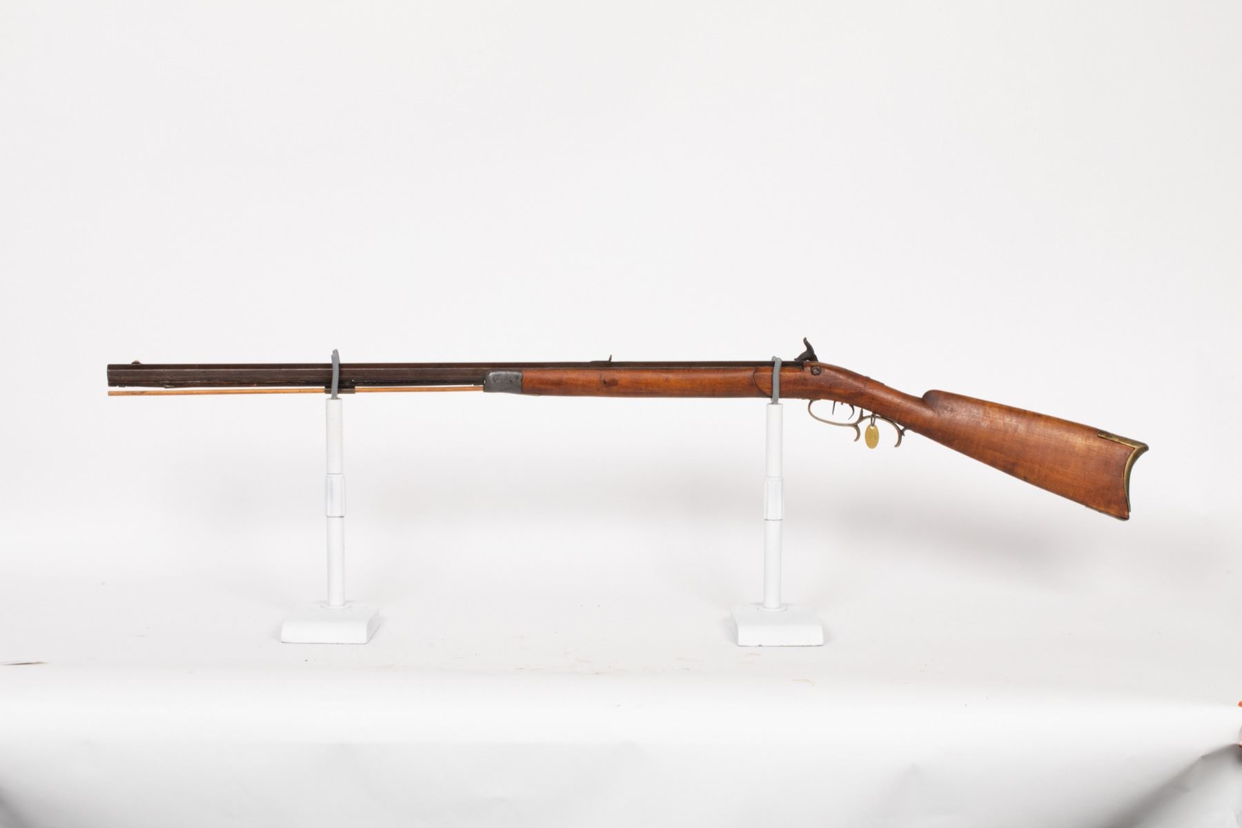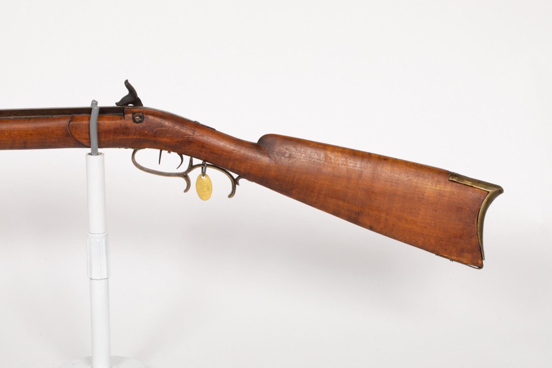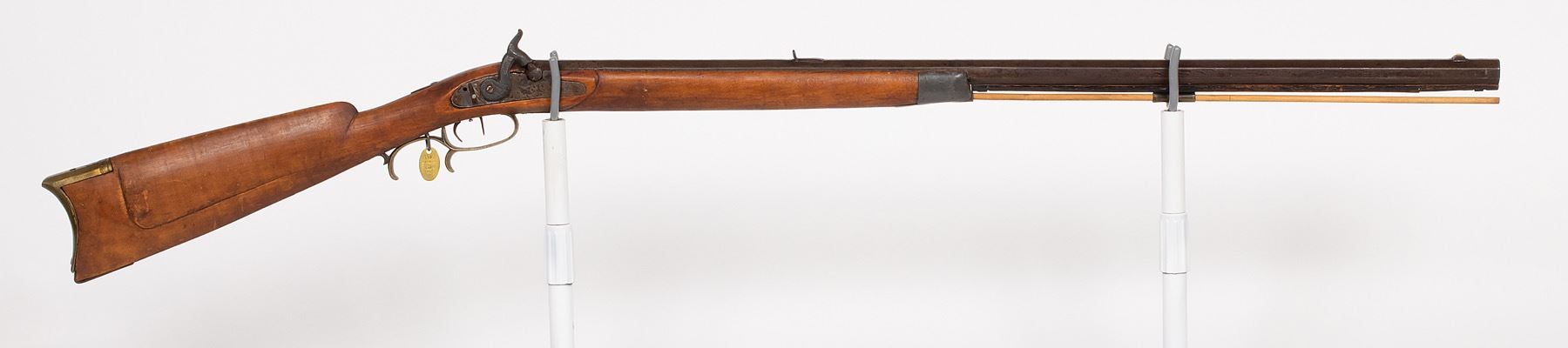 This is a half-stock Kentucky rifle from Ohio, maker unknown, in .38 cal. Light colored wood. SN: N/A, JMD Oval Tag: 2131, Condition: Good, >
