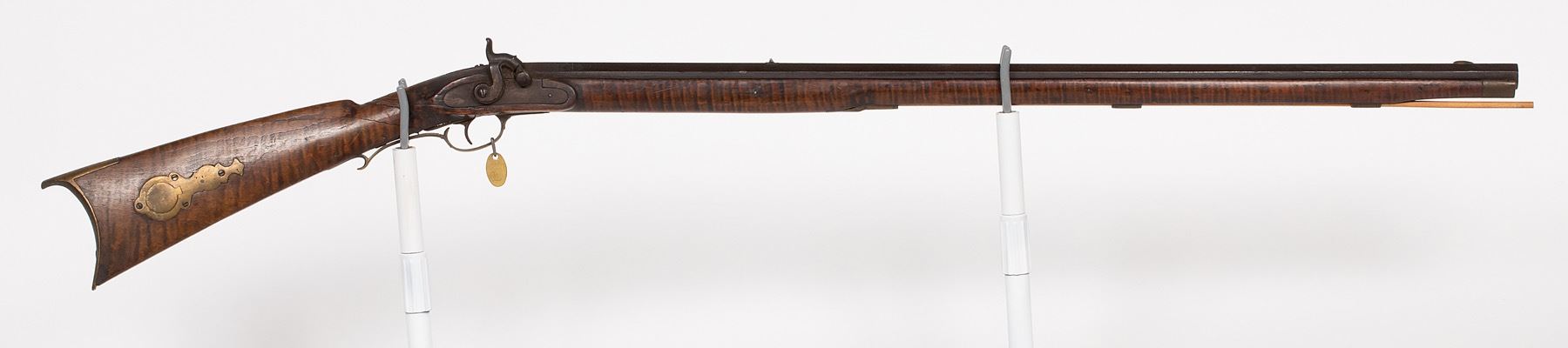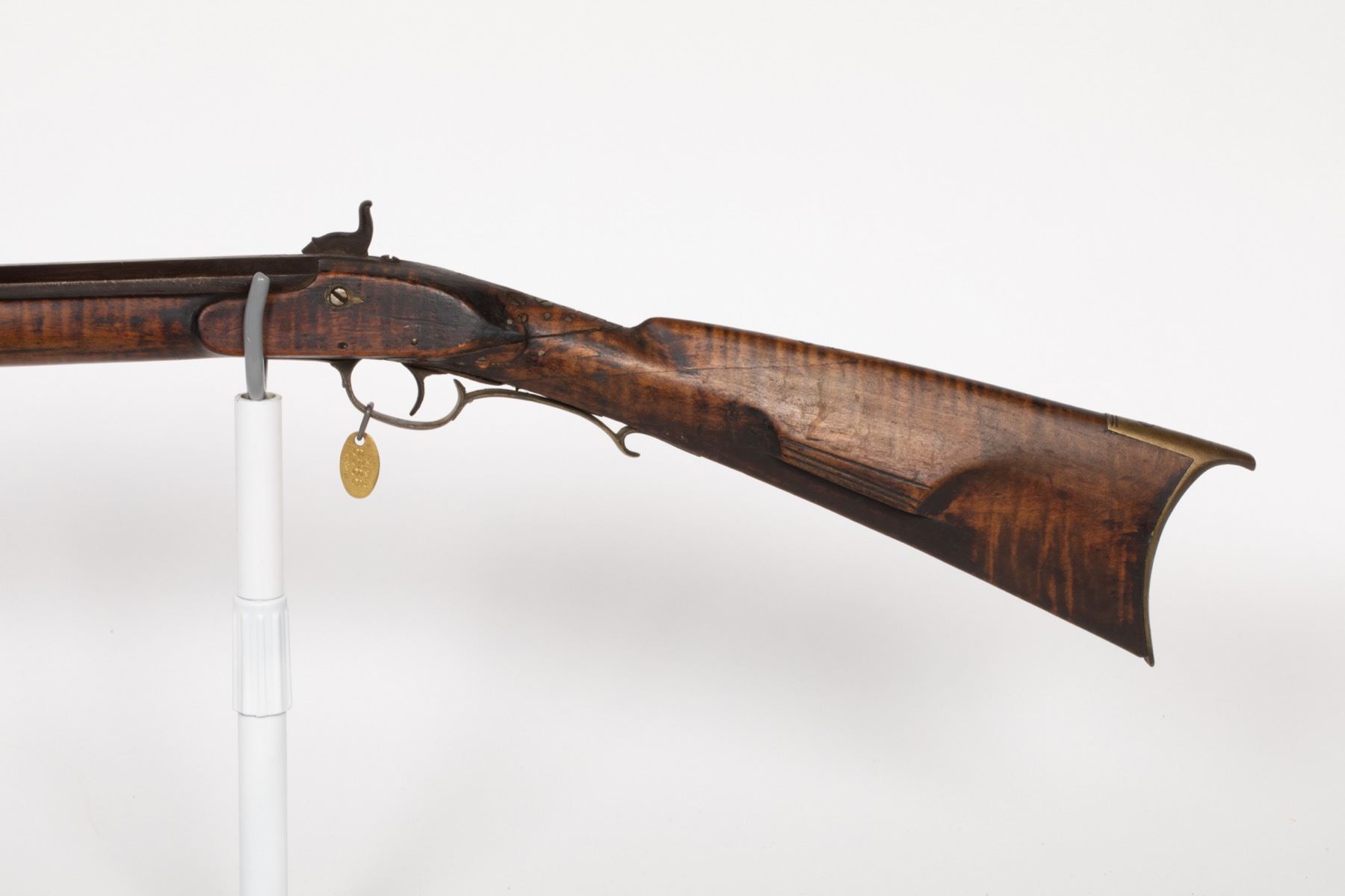 This is a Kentucky full-stock rifle possibly of Pennsylvania origin. The wood is tiger stripe maple with a very early stock repair. About .45 cal. SN: N/A, JMD Oval Tag: 6566, Condition: Good, >