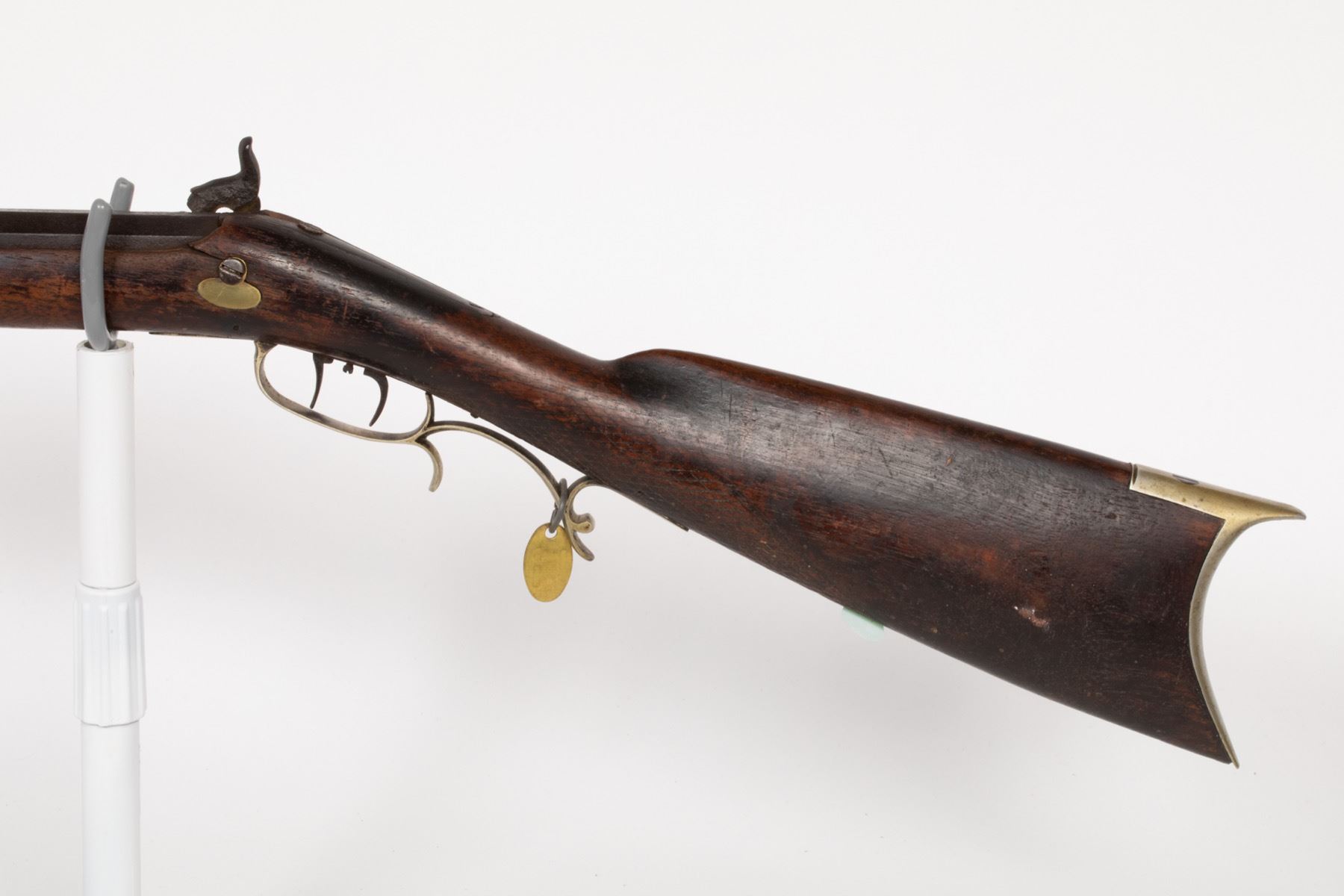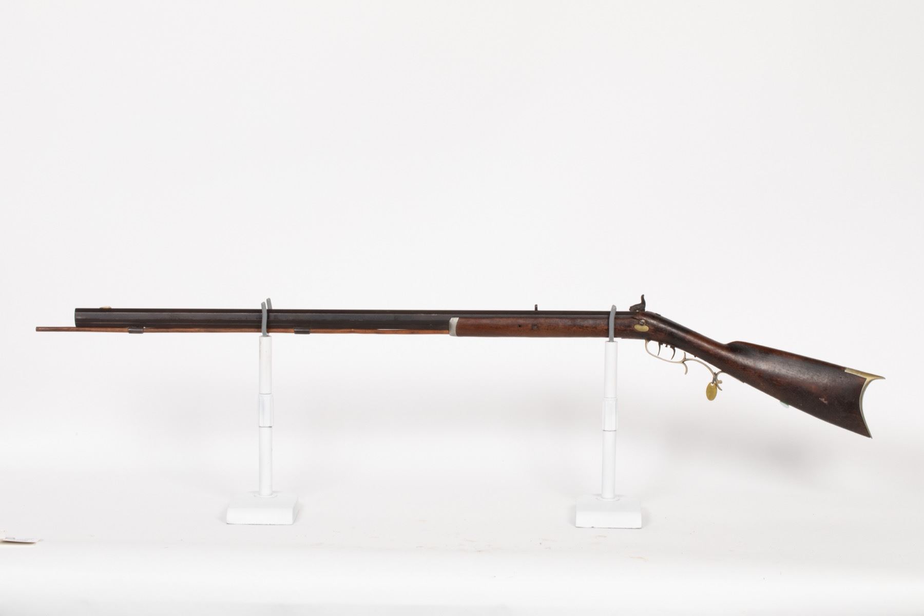 This is an Ohio half-stock rifle with a back-action lock mounted in walnut. The barrel is marked Philadelphia. SN: N/A, JMD Oval Tag: 783, Condition: Excellent, >