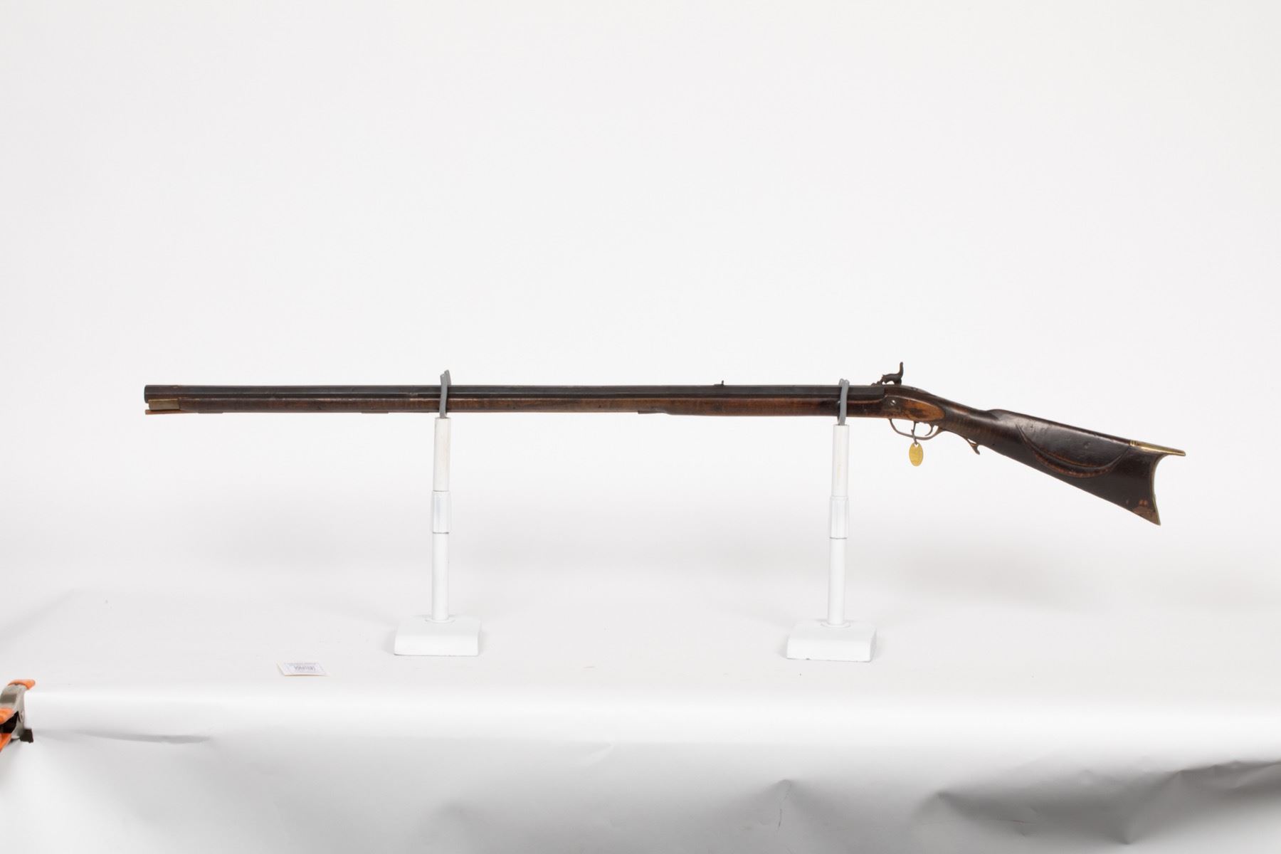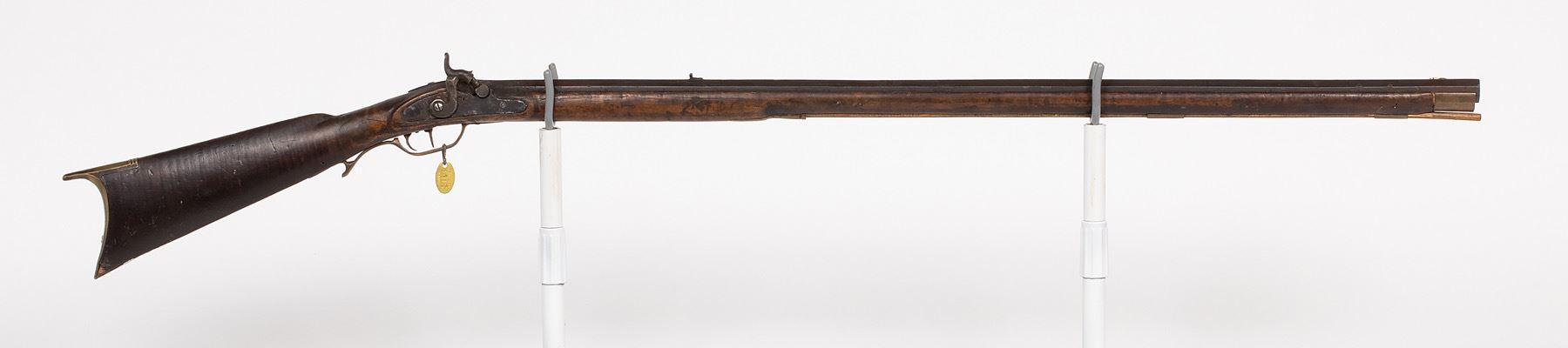 This is a full-stock Kentucky rifle from Ohio. It has a curly maple stock and percussion lock in about .34 cal. In fair-good condition. SN: N/A, JMD Oval Tag: 1915, Condition: Poor-Good, >