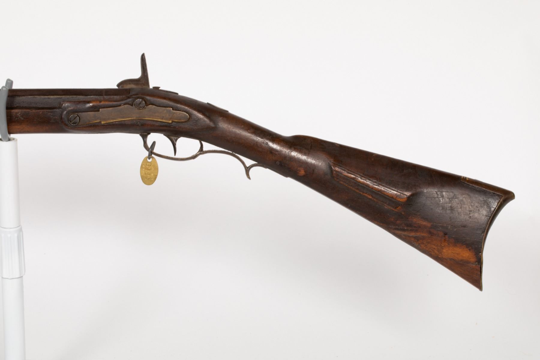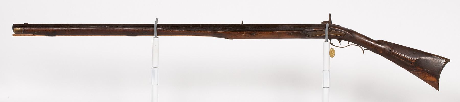 This is a full-stock Kentucky rifle of unknown maker. Possibly a Pennsylvania origin. Heavy barrel and at .42 cal. SN: N/A, JMD Oval Tag: 6925, Condition: Good, >