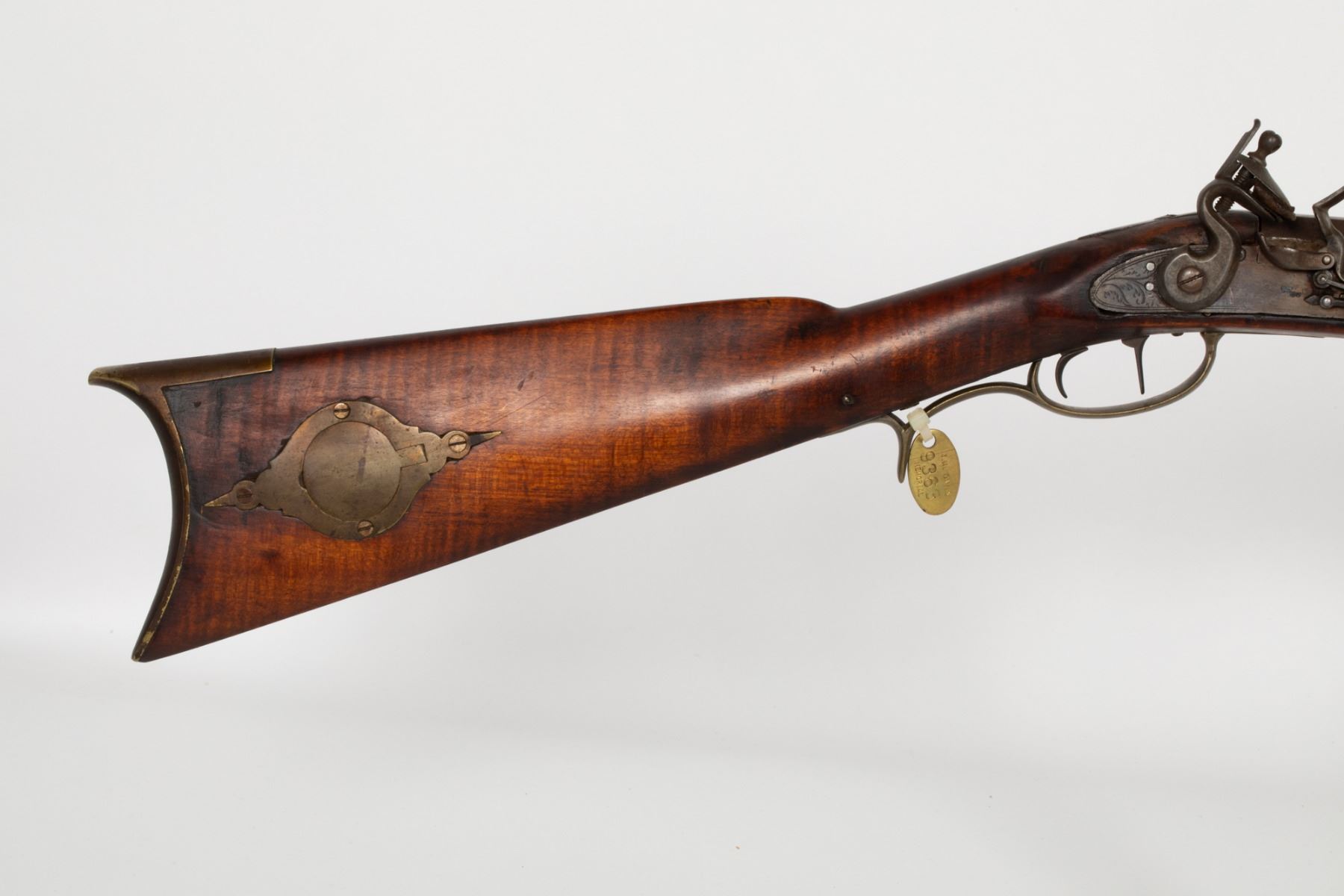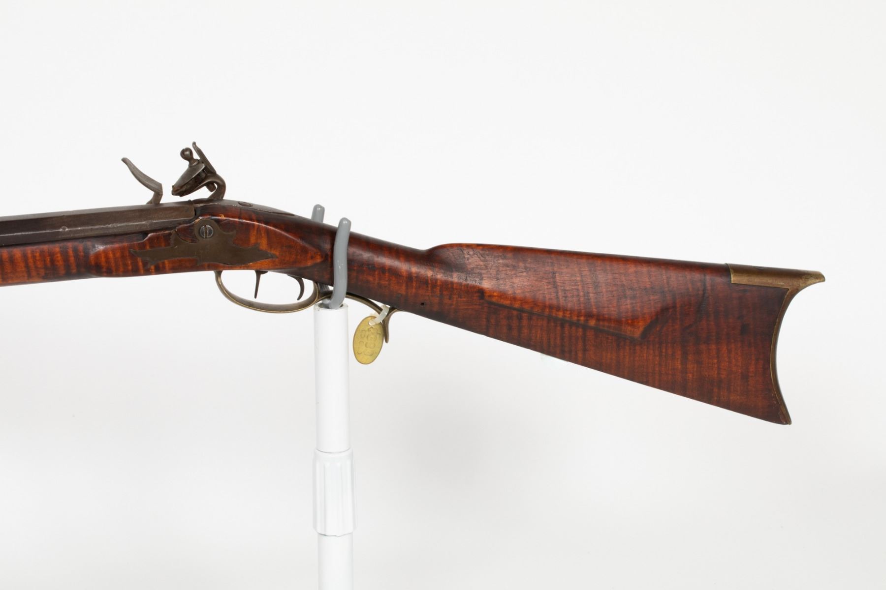 This is a beautiful full-stock Kentucky rifle with a flintlock. It appears to be all original. Maker unknown. Set riggers, a capbox for patches only, beautiful striped wood. This gun may need further research. SN: N/A, JMD Oval Tag: 9363, Condition: Good, >