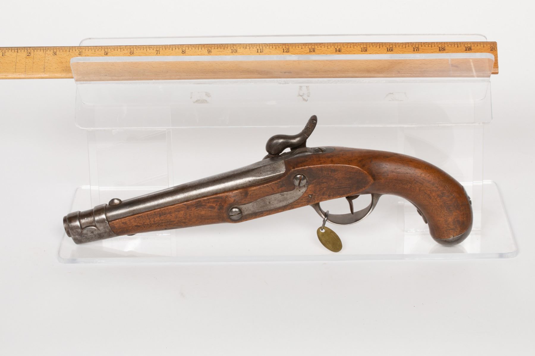 This percussion pistol, wood stock, and side plate indicate a military contract pistol. Deserves further research. SN: N/A, JMD Oval Tag: 629, Condition: Excellent, >