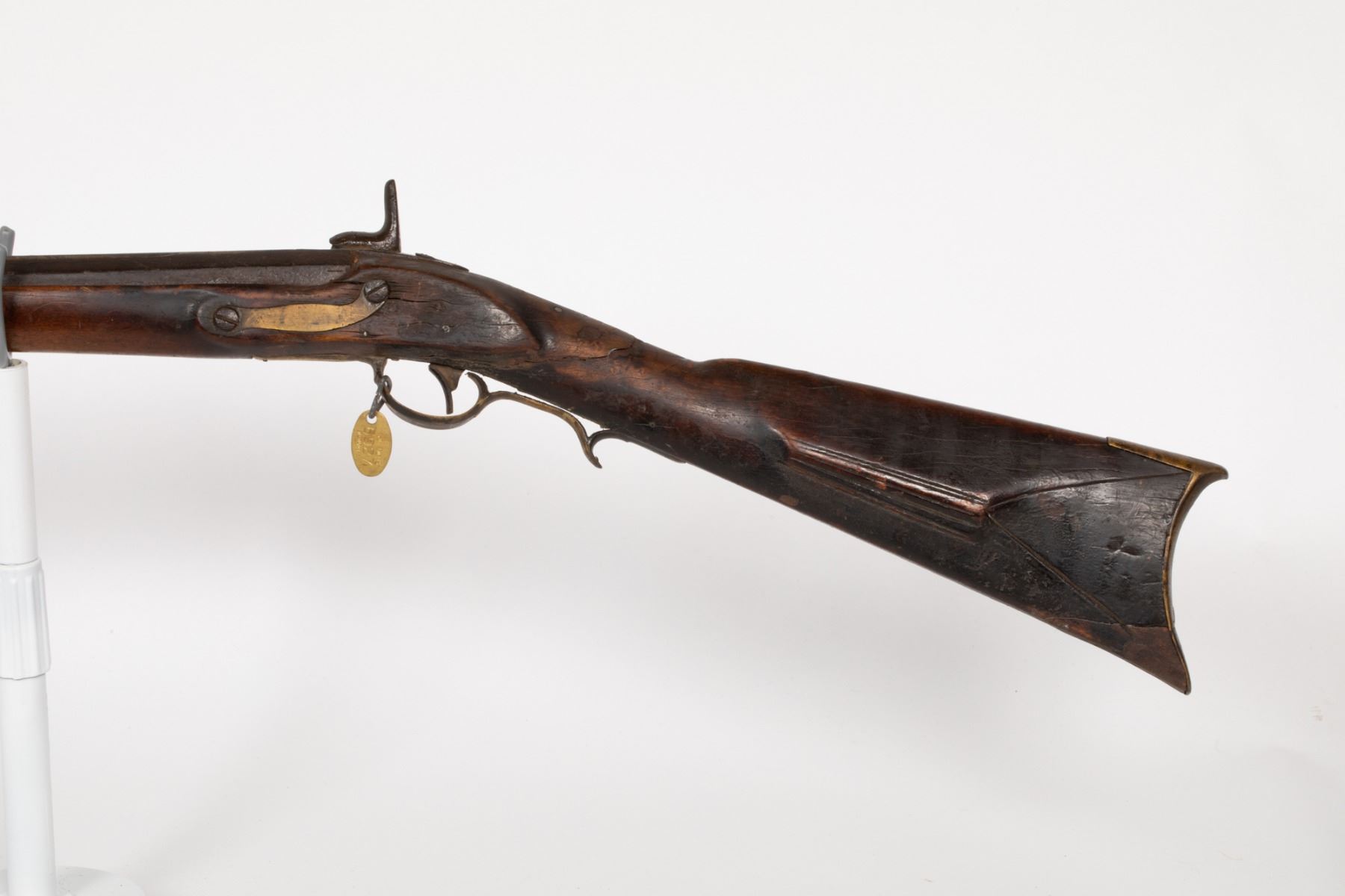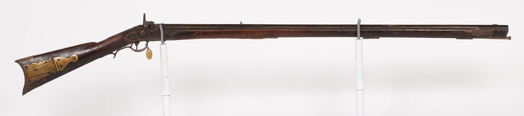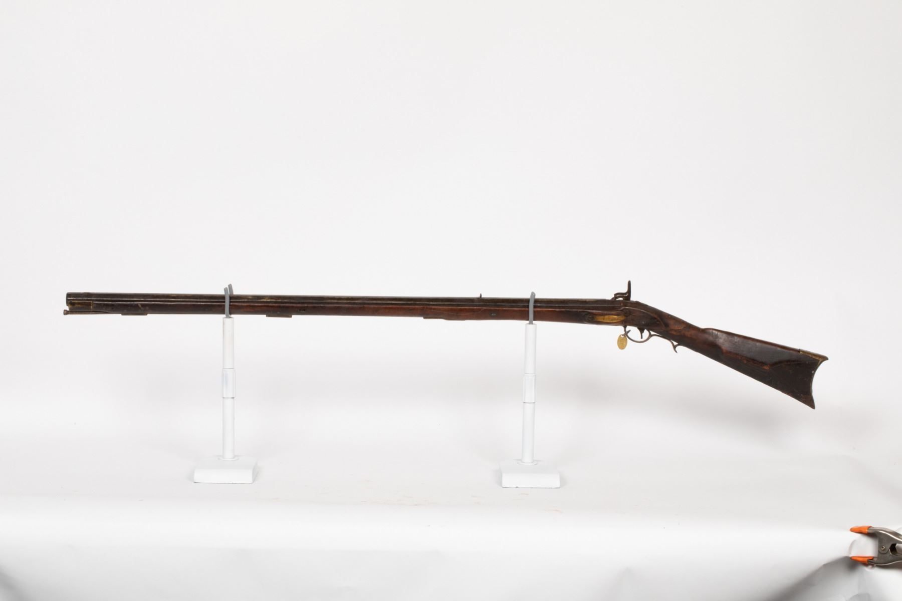 This full-stock Kentucky rifle in .54 cal. from Pennsylvania with a brass patchbox and the side plate is a re-used plate from a 1830's-1840's contract musket or pistol. In poor condition. SN: N/A, JMD Oval Tag: 6927, Condition: Poor, >