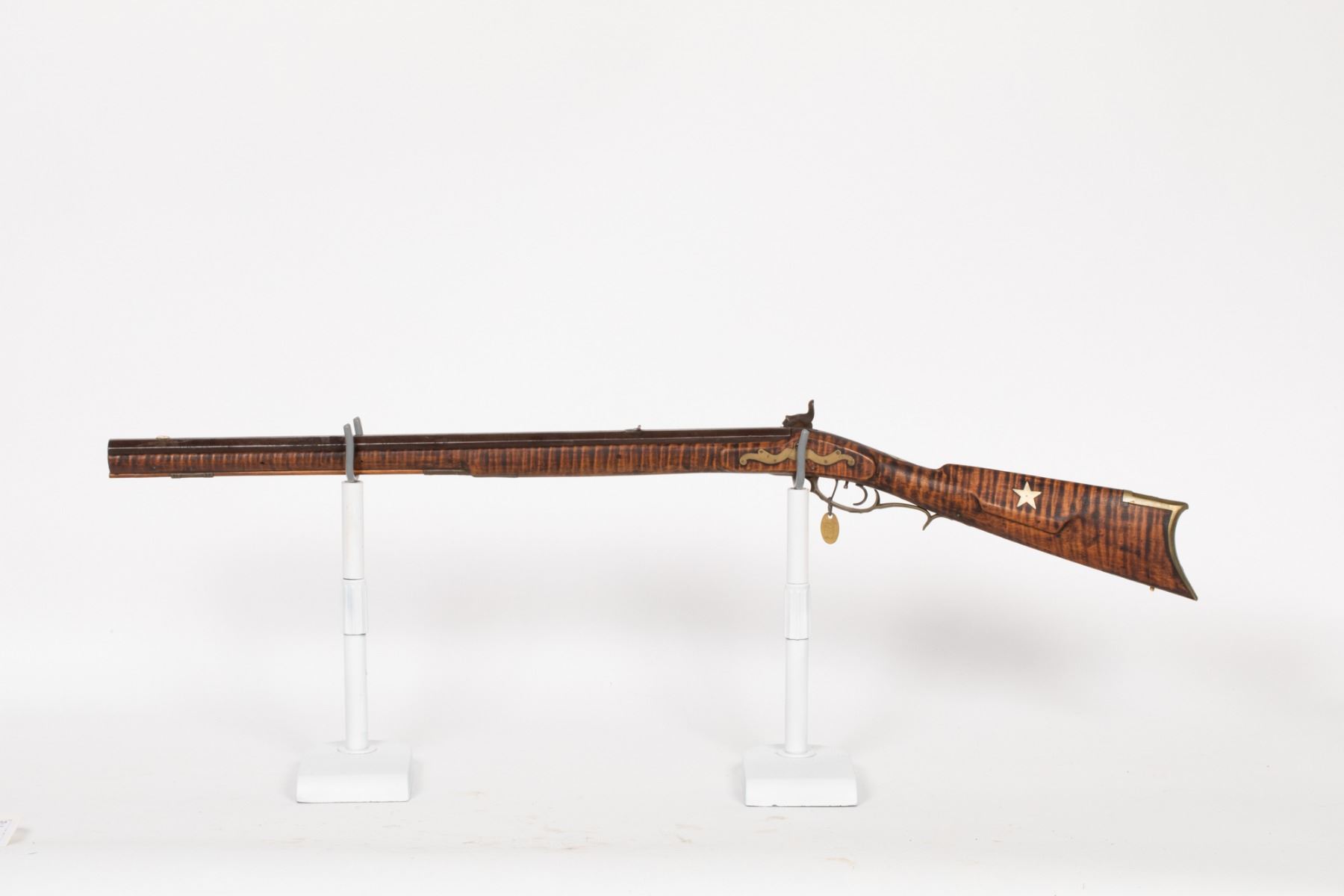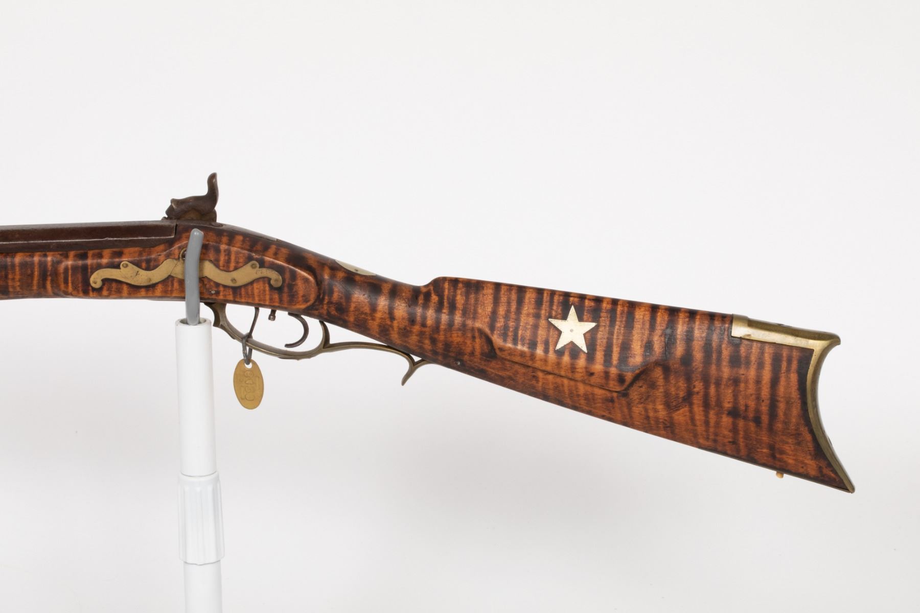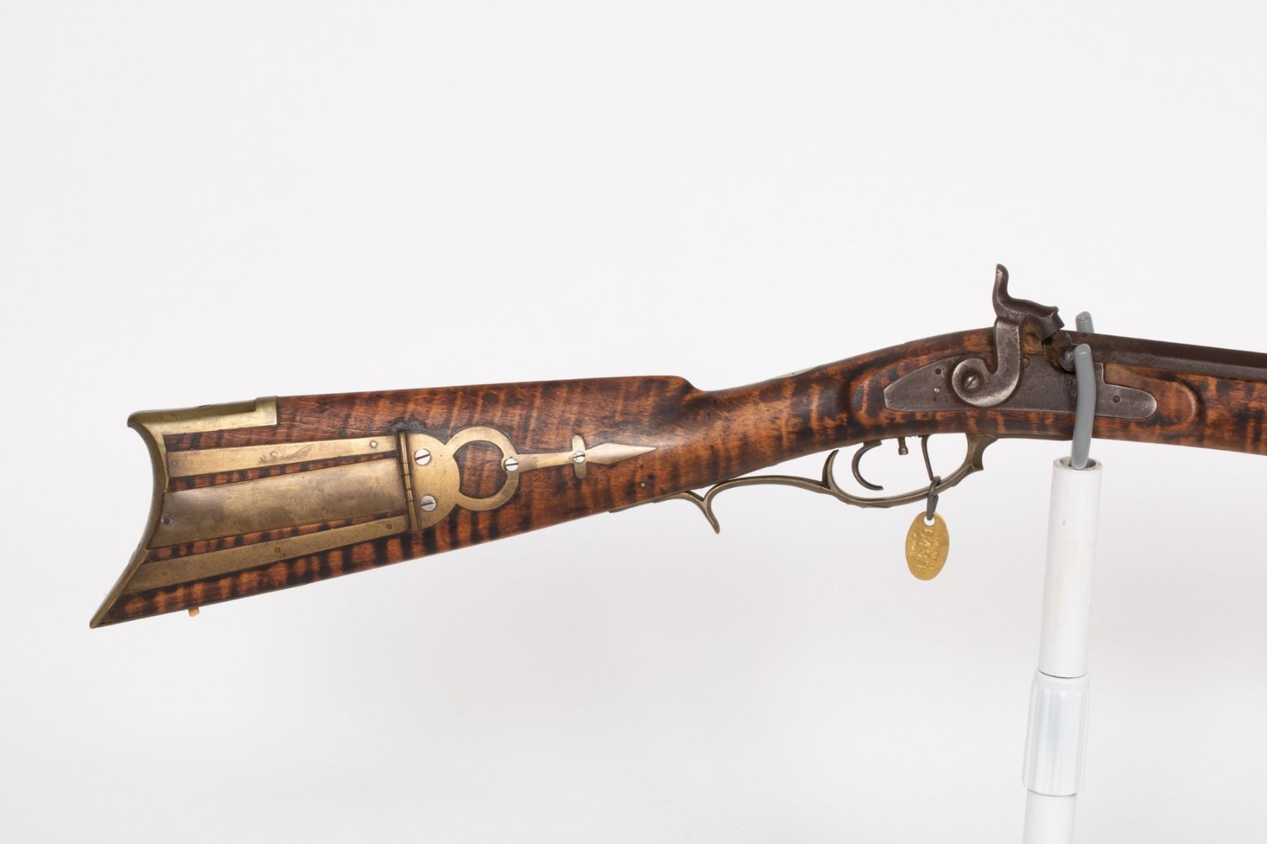 This is a full-stock Kentucky rifle that has been shortened in its operating lifetime; often referred to as a boyÕs rifle. This may be a Huntingdon Co., Pennsylvania rifle or an Ohio gun. May need further research to identify the gunsmith. About .30 cal. with fine tiger-stripe maple. SN: N/A, JMD Oval Tag: 6439, Condition: Very Good, >