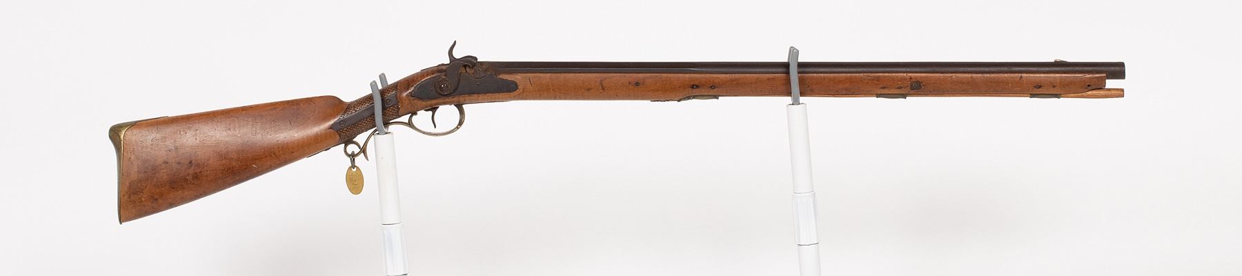 This is a full-stock rifle that may have been shortened for a boy. In 16 ga. with a crack in the stock at the wrist. SN: N/A, JMD Oval Tag: 6341, Condition: Fair, >