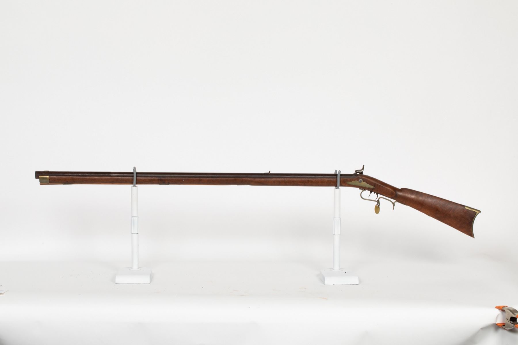 This gun has a back-action lock with the cheek piece on the right side (for a left handed person shooting a right handed gun?). The barrel is octagon to round to octagon at the muzzle. This may be a marriage of parts. SN: N/A, JMD Oval Tag: 2175, Condition: Fair, >